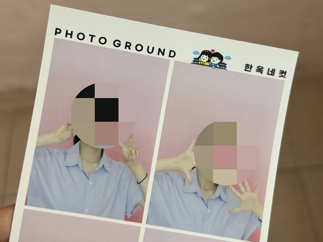 이 순간을 기록으로 남기고자 네컷 사진을 찍으러 갔다. 찾아보니 전주 프레임이 있는 곳이 거의 없어서 그나마 전주 느낌 나는 '한옥 네컷'으로 갔다. 나처럼 혼자 온 사람들을 위해 3천원에 1장만 뽑을 수 있는 옵션도 있어서 이걸로 골랐다. 혼자 네컷사진을 찍을 일이 별로 없다 보니 들어가는 순간부터 정신이 하나도 없었다. 그래서 파란색 옷을 입고 핑크색 배경을 고르는 실수를 저질러버렸다. 그치만 괜찮아 다음에 더 잘 찍으면 되니까! 잘 나오진 않았어도 이날을 기억하고 간직할 수 있어서 좋았다.