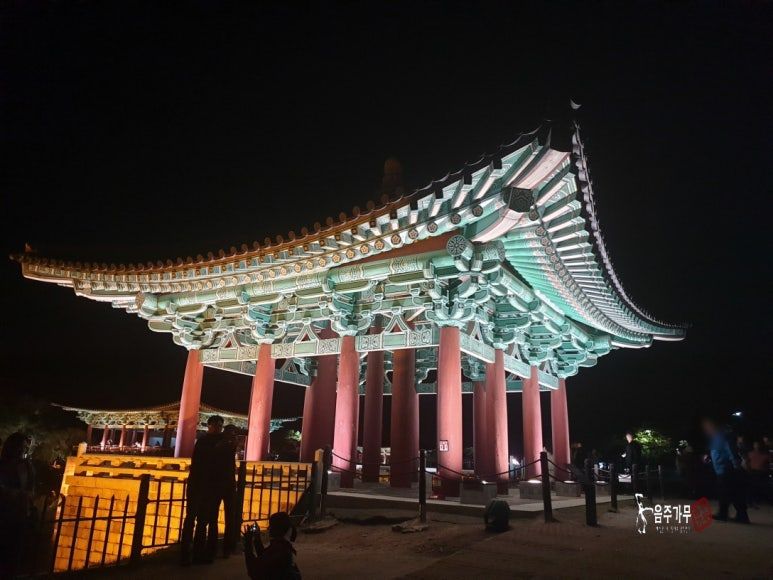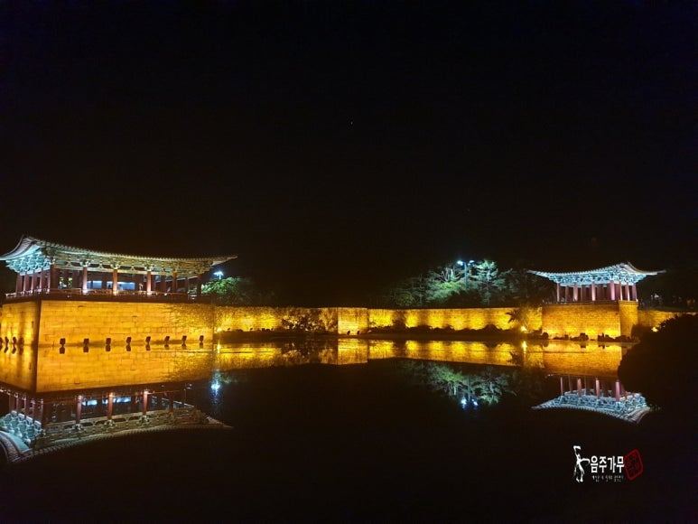 잔잔한 연못 위에 조명을 받은 전각들이 거울처럼 비치는 반영은 동궁과 월지의 하이라이트, 하절기 여름시즌 피는 연꽃은 없지만, 나뭇가지 위로 내려앉은 조명과 고요한 산책로가 깊은 역사적 정취를 자아냅니다.