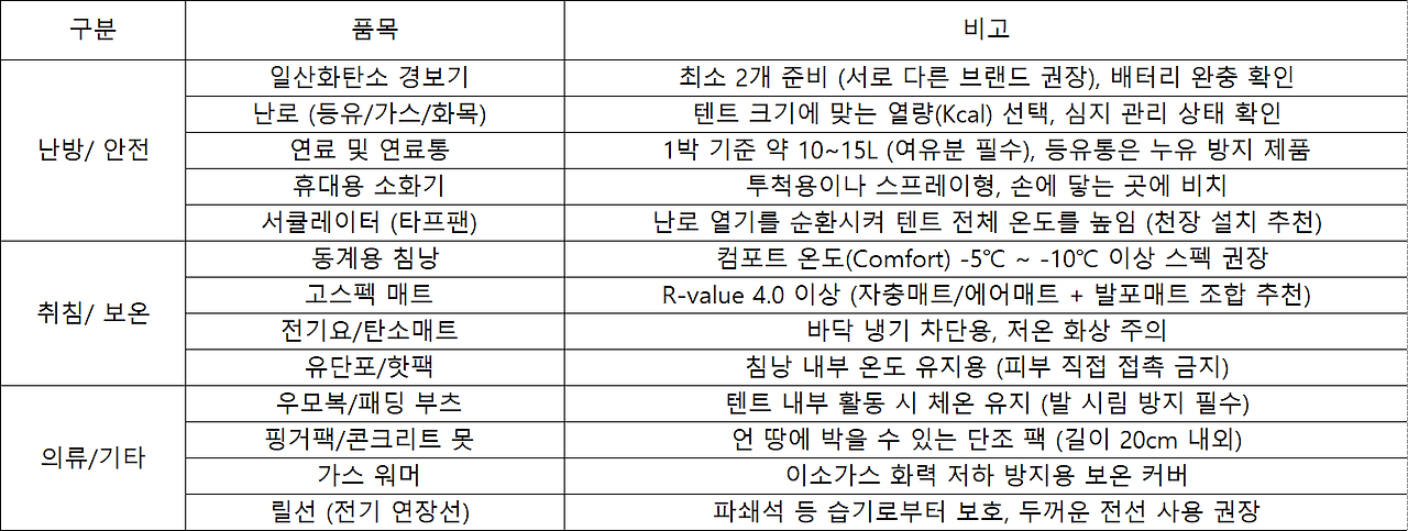 겨울 동계캠핑은 눈 덮인 풍경과 고요한 분위기라는 낭만이 있지만, 사계절 중 가장 위험 요소가 많은 계절이기도 하다. 한순간의 실수가 생명과 직결될 수 있는 만큼, 철저한 준비와 안전 수칙 준수가 필수, 안전하고 따뜻한 캠핑을 위해 반드시 숙지해야 할 핵심 주의사항 정리해 본다.