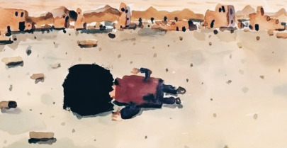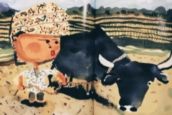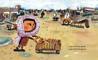 이제 소년의 생각은 이웃에 사는 친구들에서 이웃나라로 확장됩니다. 이웃나라 여자아이는 아기를 업고 있고, 같은 순간 이웃나라 남자아이는 소를 몰고 있습니다. 소를 모는 아이 맞은편 나라에서는 여자아이가 수레를 끌며 빵을 팔고 있습니다. 같은 때에 산 너머 나라 남자아이는 쓰러져 있습니다. 쓰러진 아이는 꼼짝을 않습니다. 다음 장에서도 아이는 아무 움직임이 없습니다. 그 위로 바람이 붑니다. 그리고 바로 그때, 라면을 먹고 있는 아이 집 창에도 바람이 붑니다.