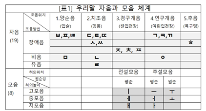 위의 배열에 따라 자음 소리가 만들어지는 조음위치에 번호를 붙이면 아래와 같습니다. 위에 있는 자음과 모음체계 표를 참고하세요.