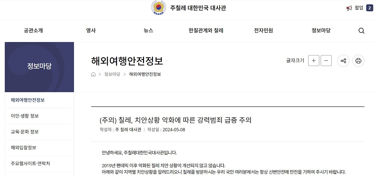 심지어 외교부에서도 칠레 방문 시 강도와 소매치기에 유의하라며, 여행자들의 휴식처 스타벅스를 범죄 빈발 장소로 꼽고 있었다. 카메라와 핸드폰 노출에 주의하라니 그럼 사진은 어떻게 찍는단 말인가! 심지어 몇몇 장소는 '예방책이 없으니 방문을 자제'할 것을 당부하기까지 했다.