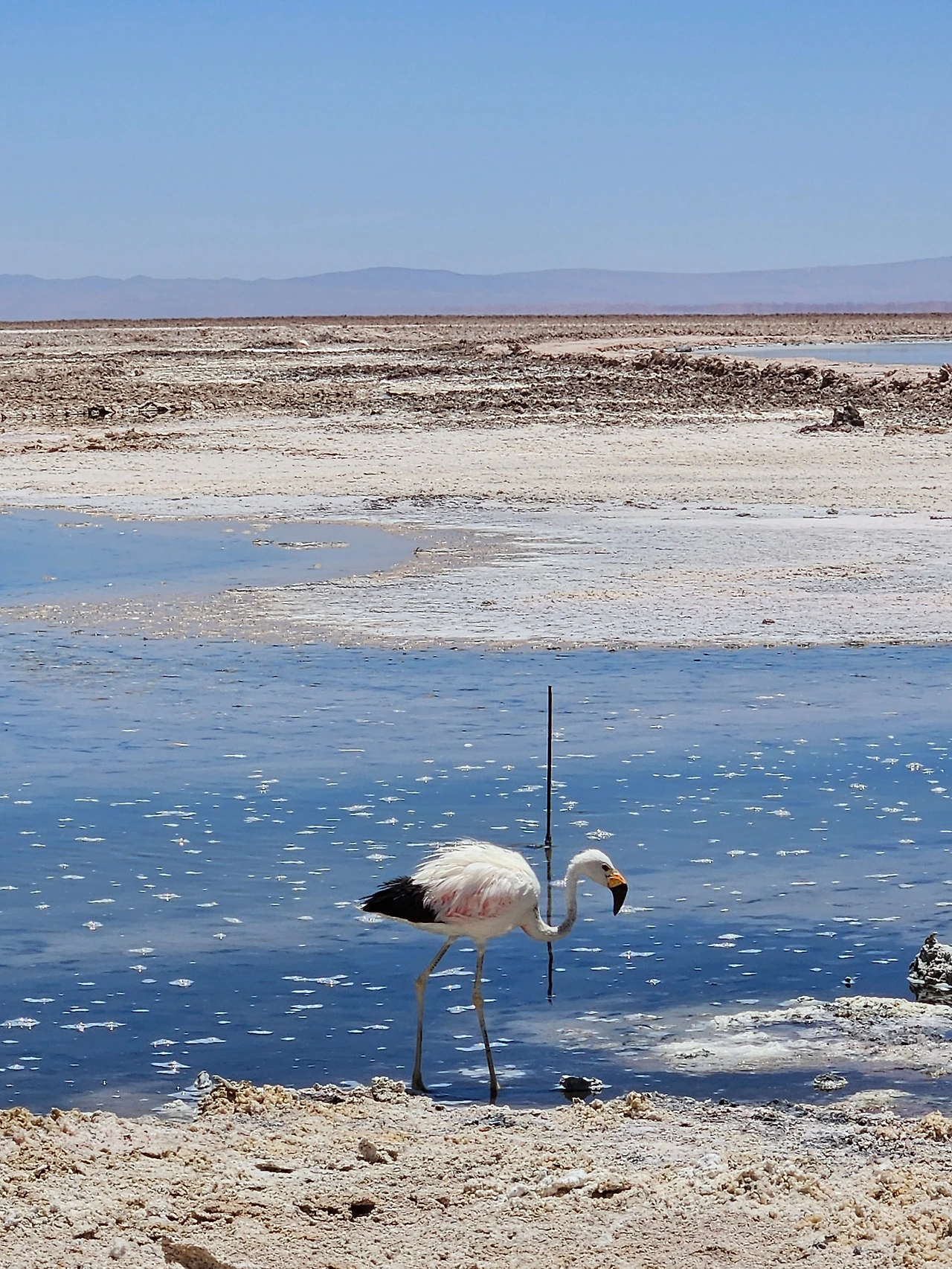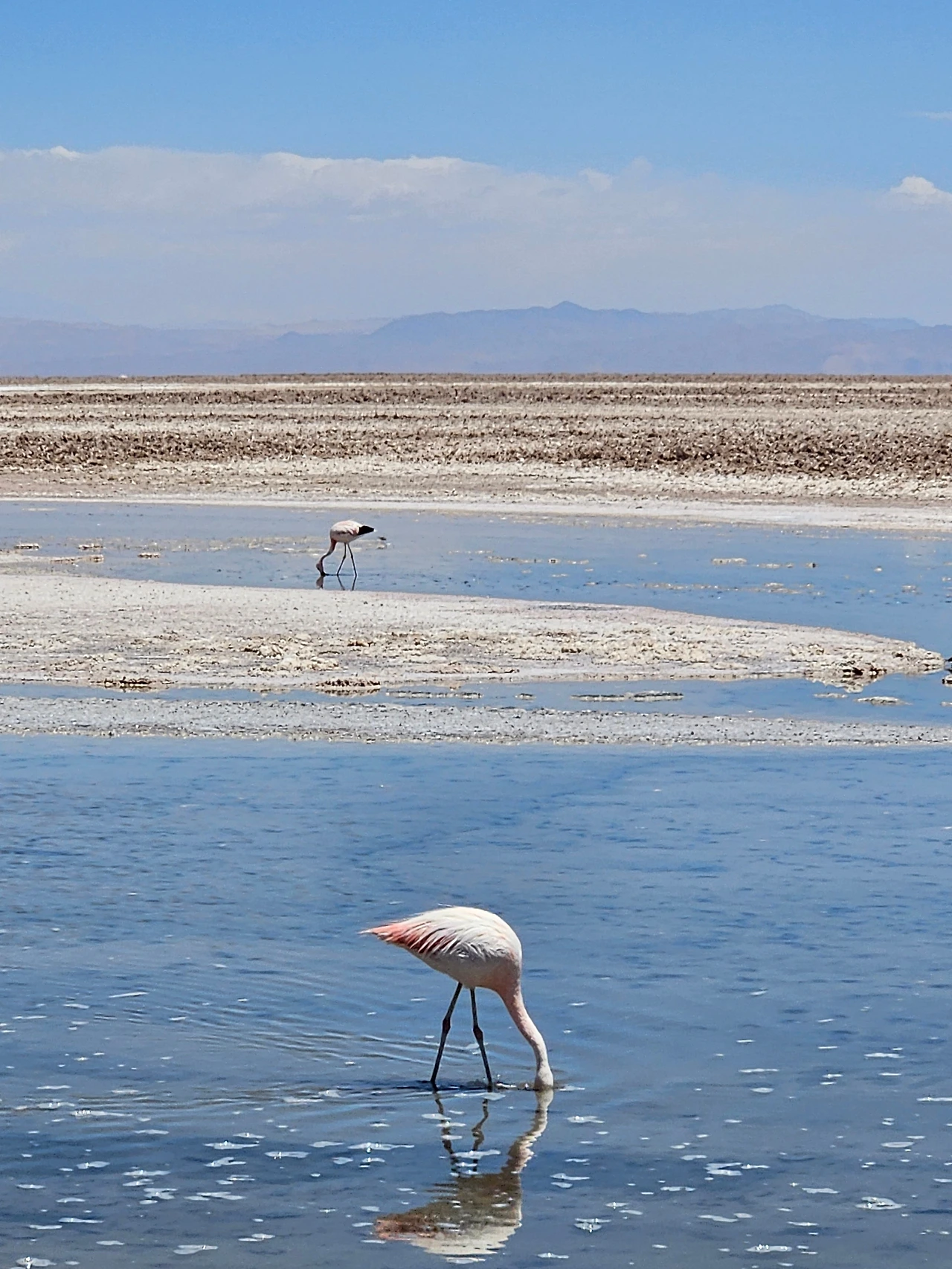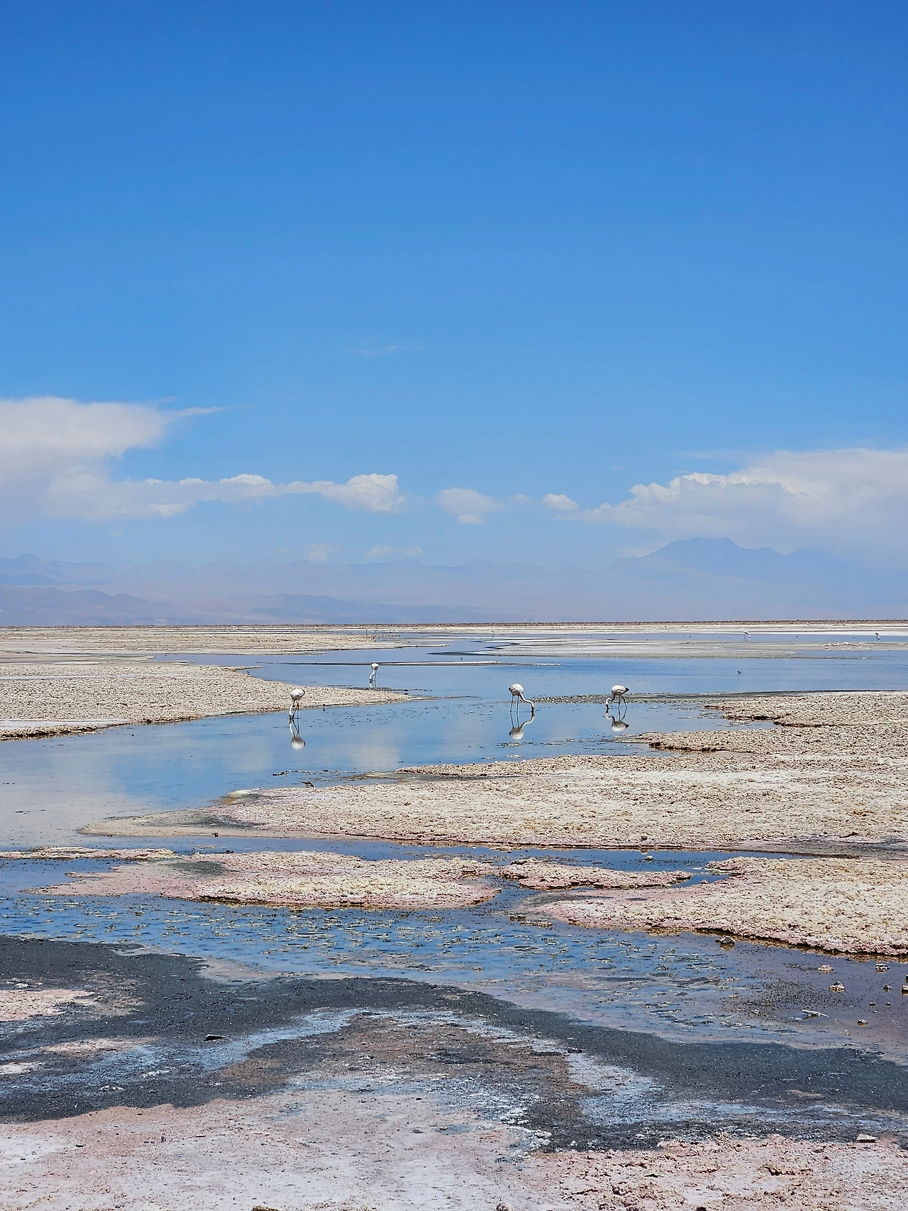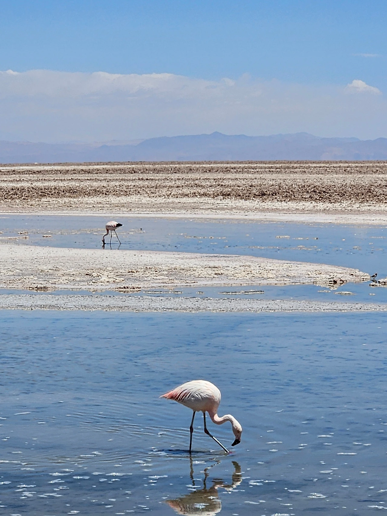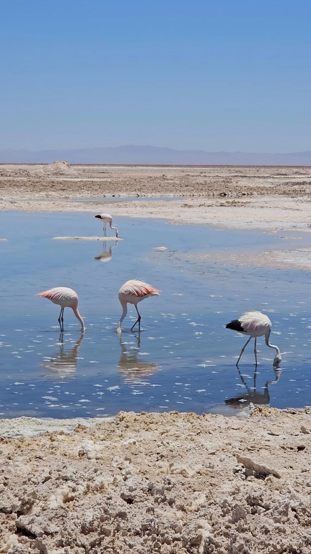 뜨거운 태양 아래 그늘 하나 없는 길을 한참 걸어가니 양 옆으로 호수가 펄쳐졌다. 오른쪽 호수에 플라밍고들이 떼거지로 모여있었다. 이곳은 플라밍고 전망 포인트라고는 하지만 플라밍고를 놀래켜서는 안 되기 때문에 그저 멀리서 바라보기만 할 수 있다. 먼저 갔던 호수에서 개미만한 플라밍고를 보았다면 여기서는 살짝 더 가까워져서 무당벌레만 하다는 차이 정도?이곳에서는 플라밍고의 동물권이나 어찌나 철저하게 보호되는지, 가이드 A가 일러준 주의사항 중에는 플라밍고가 놀랄 수도 있으니 큰 소리로 말하는 것을 자제하라는 이야기도 있었다!