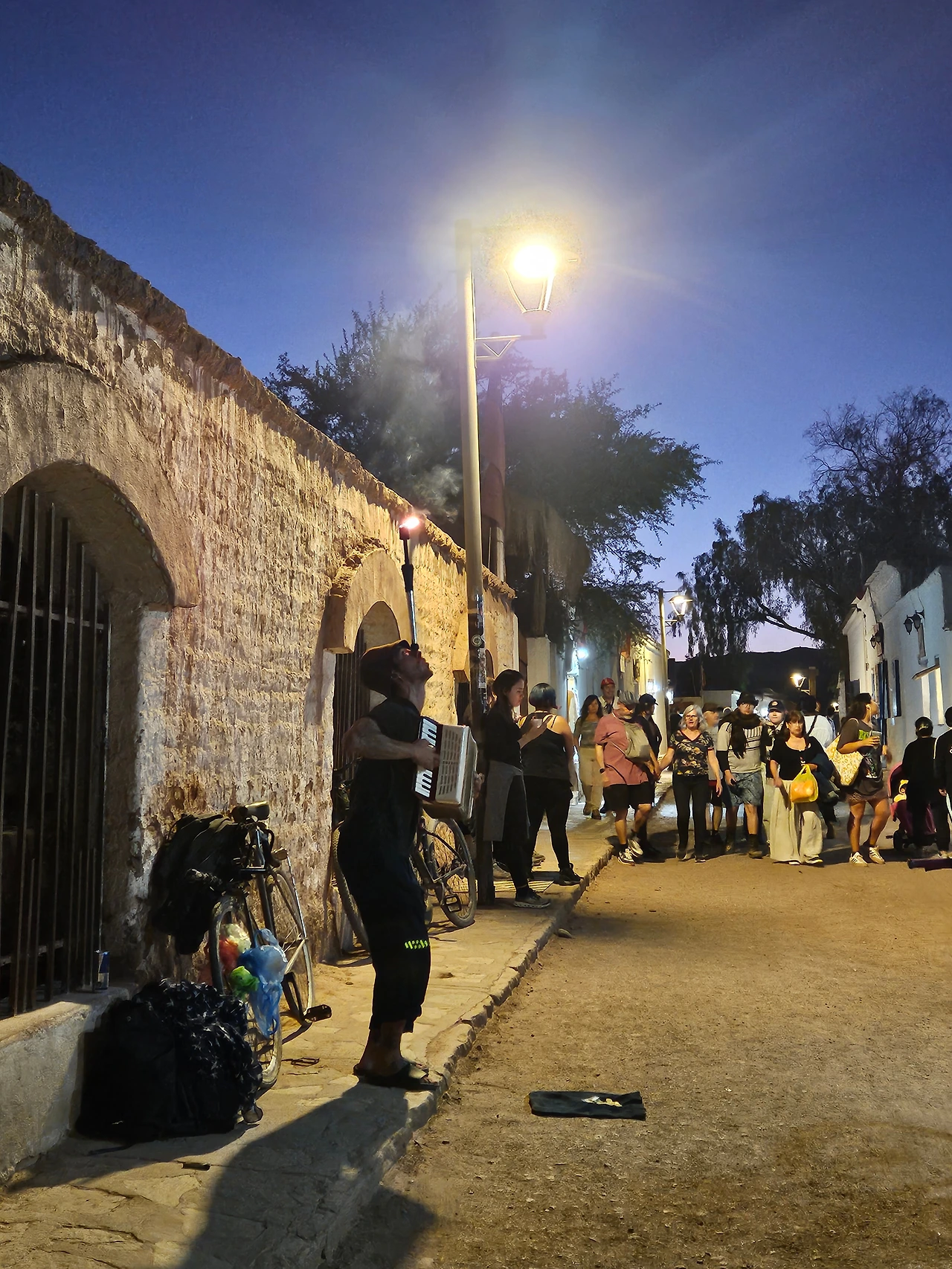 나에게 아타카마의 낮은 시원하고 밤은 따뜻하다. 아이러니하게도 기온과는 정반대로 기억된다. 뜨거운 태양이 내리쬐는 무더운 낮은 초록초록하게 우거진 나무들로 인해 시원했던 것 같은 착각이 들고, 태양이 사라지자마자 확 서늘해지는 밤은 길거리를 가득 채운 노란 불빛들로 인해, 그리고 밤거리에서 마주친 사람들로 따뜻한 기억만 남아있다. 아타카마의 밤은 활기가 넘친다. 흥 많은 이들의 노랫소리, 춤사위, 그리고 곳곳의 악기 연주까지. 그들 틈에 끼어들어 함께 춤을 춰도 좋다. 그들이 따뜻하게 맞아줄 것이다.