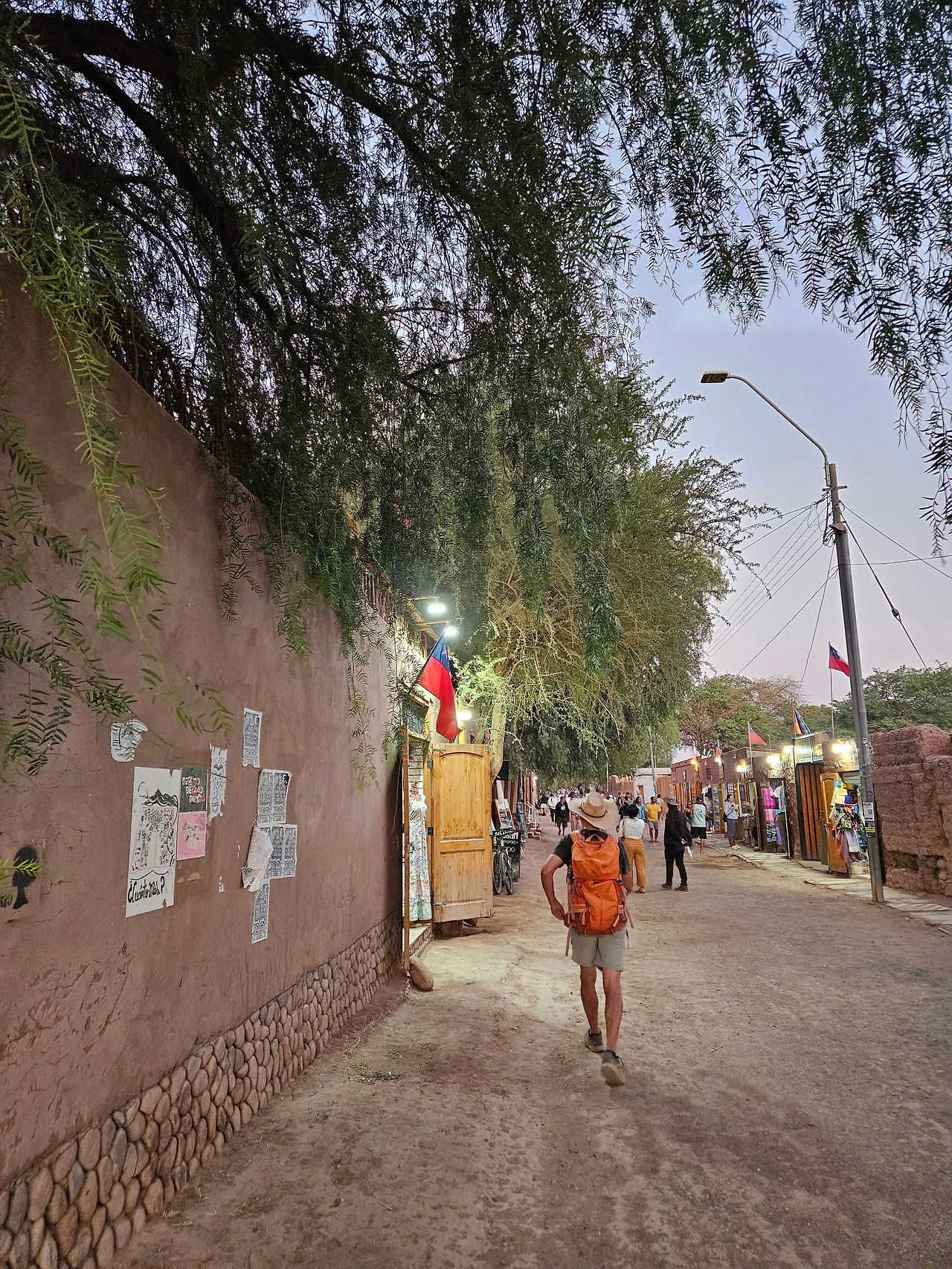 아타카마의 밤은 아주 늦게 찾아온다. 낮잠을 너무 오래 자서 망했다 생각하며 급히 뛰쳐나온 아타카마의 거리, 다행히 저녁 8시반이 되도록 아직 어둠이 찾아오지 않았다. 이 거리에서 내가 가장 좋아하던 곳 앞에 멈춰 서서 한참을 서성였다. 흐드러지게 축 늘어진 나무와 그 아래 흙벽에 아무렇게나 붙은 포스터들, 내게는 가장 아타카마스러운 모습으로 기억될 그 지점에서 조금 더 오래 머물고 싶었다.