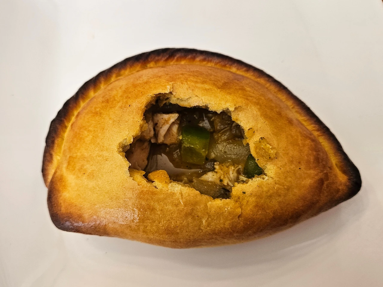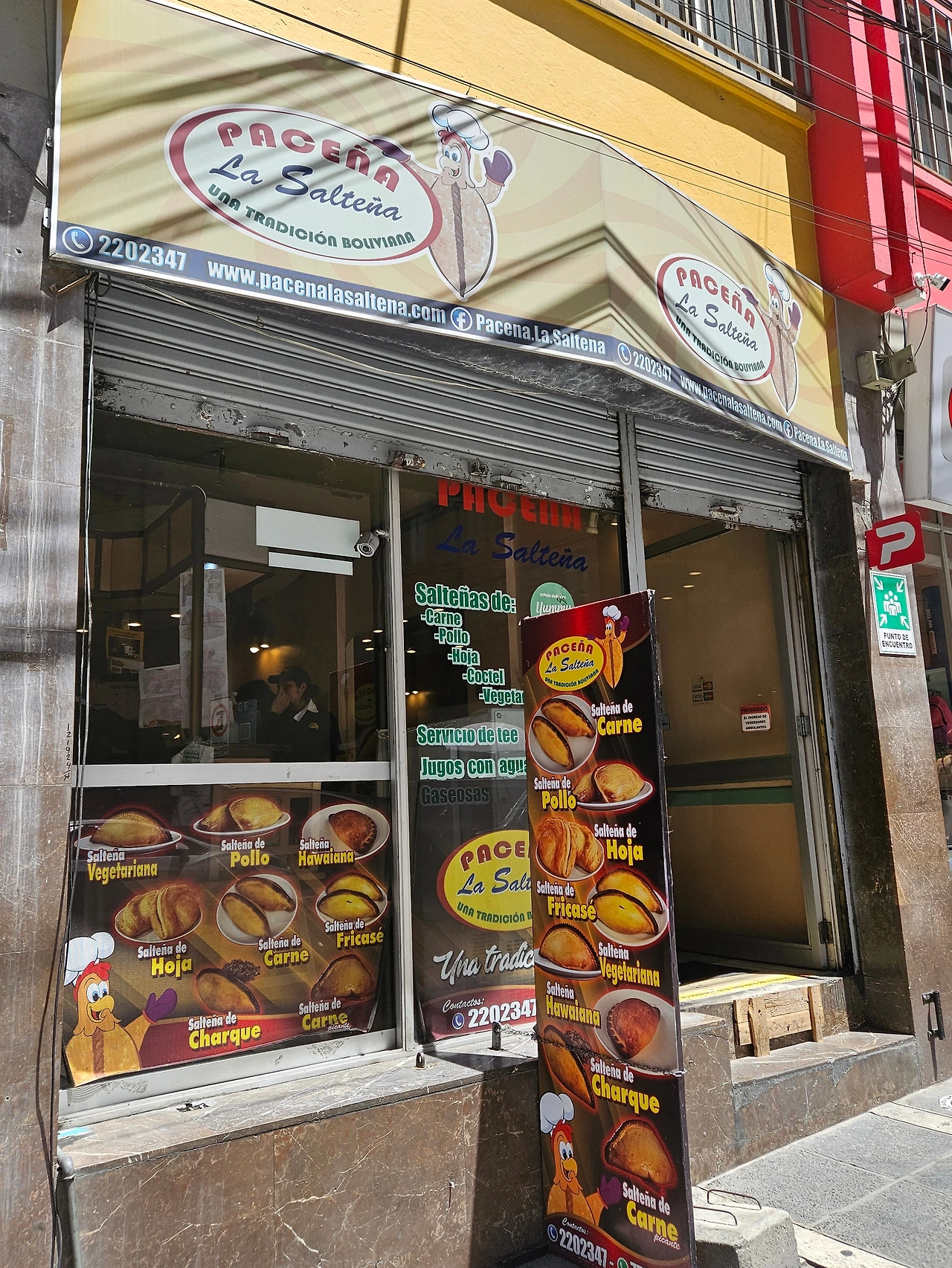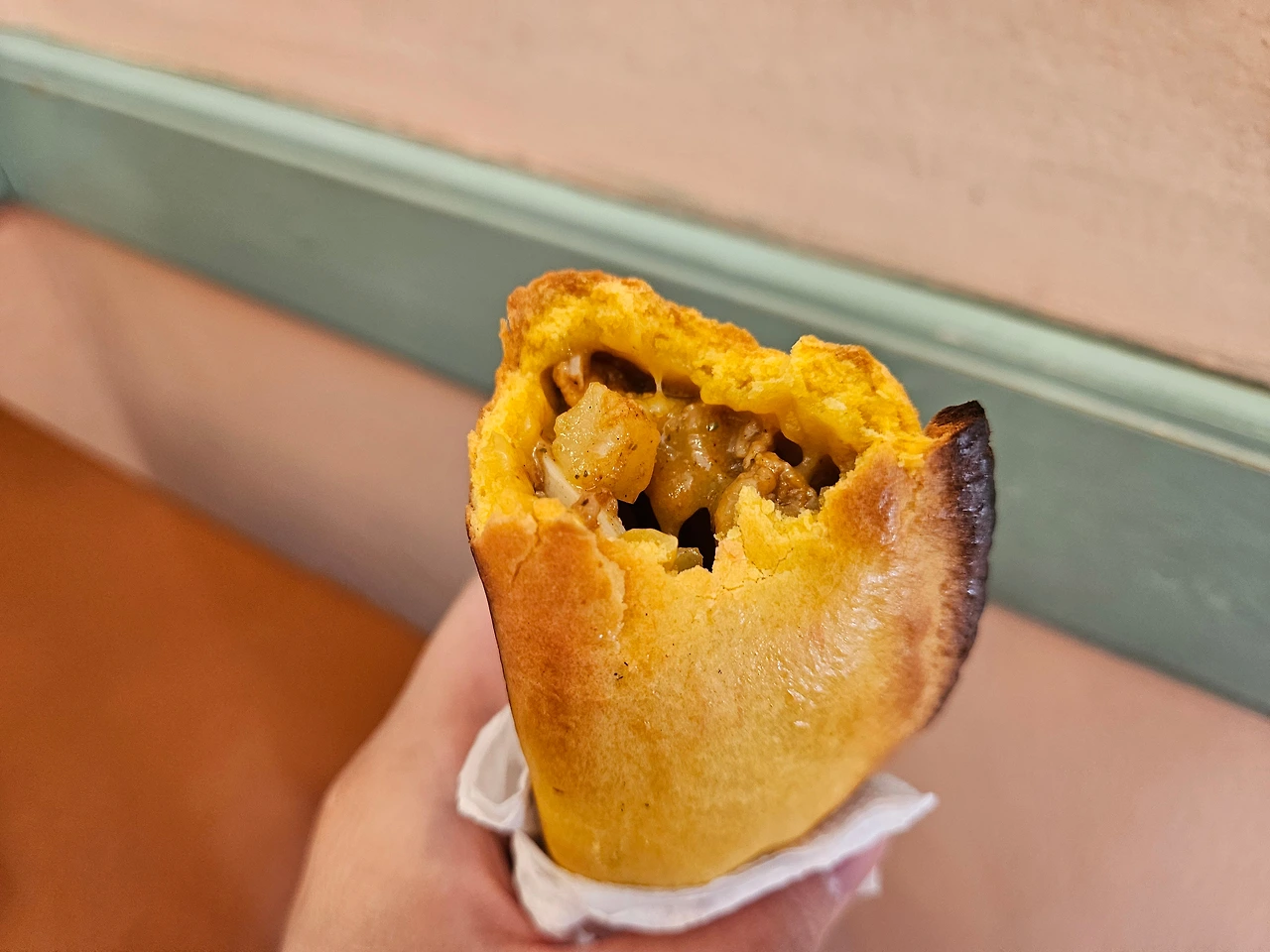 볼리비아에서 꼭 먹어봐야 하는 단 한 가지의 음식을 꼽으라면 나는 무조건 '살테냐'를 꼽을 것이다. 엠빠나다에서 변형된 볼리비아의 대표 간식으로, 한국어로 설명하자면 '고기파이'쯤 되겠다. 밀가루 반죽 안에 고기, 야채, 계란 등을 넣고 구운 요리로, 엠빠나다보다 빵이 더 달달하고 바삭하고, 속은 육즙이 가득해 촉촉하다. 속재료에 따라 닭고기, 야채, 매운 맛 등등 종류도 여러가지. 첫 시식이니 가장 기본 맛을 시켰다.