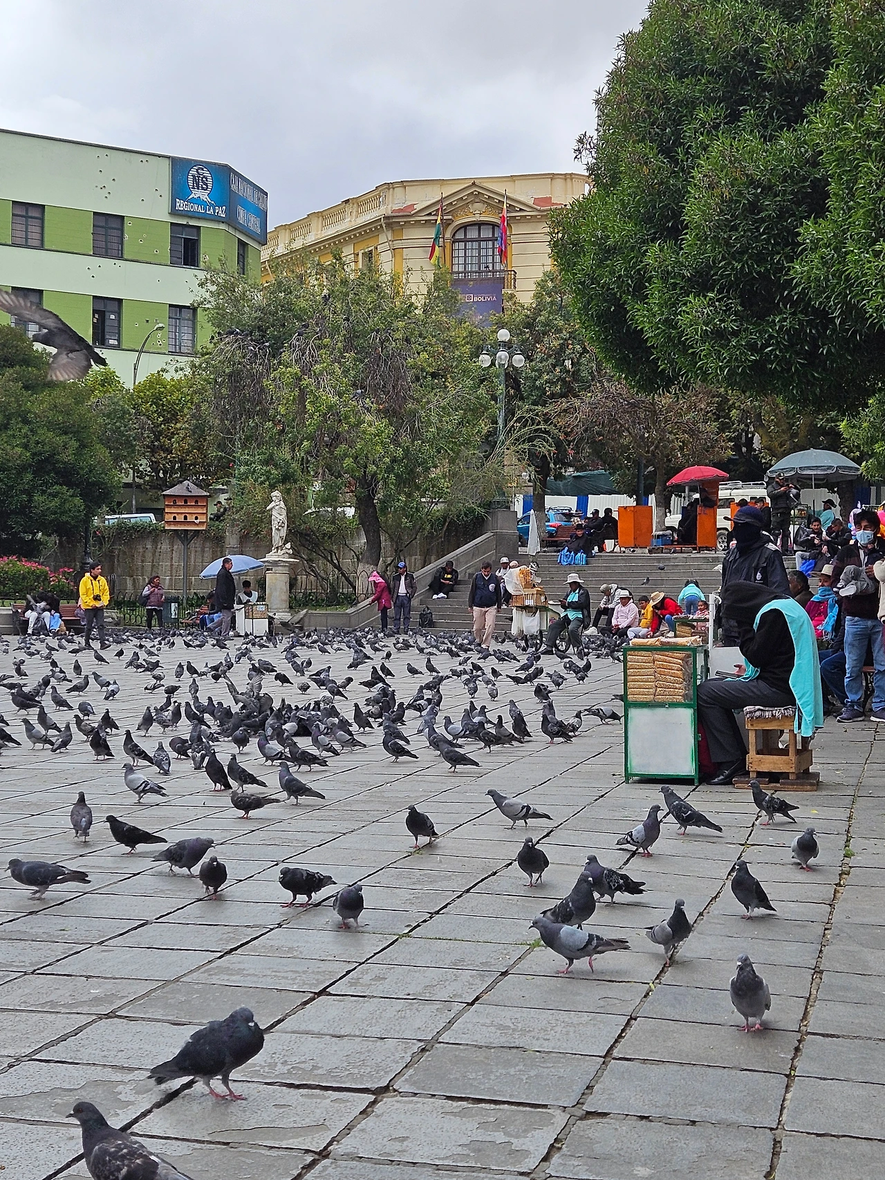 겨우 마녀시장으로 급히 발걸음을 옮겼는데, 가는 길에 또 다시 놀라운 광경에 시선을 빼앗겼다. 구구구구, 퍼덕퍼덕, 온통 비둘기 소리로 가득한 광장이 나왔다. 라파즈에는 차만 유독 많은 것이 아니라 비둘기도 유독 많다. 혀를 내두를 정도로 징그럽게 많이 모인 비둘기들의 파티 현장이었다. 모두 비행 능력을 상실한 듯 당당히 인간처럼 광장을 걸어다니고 있었다.