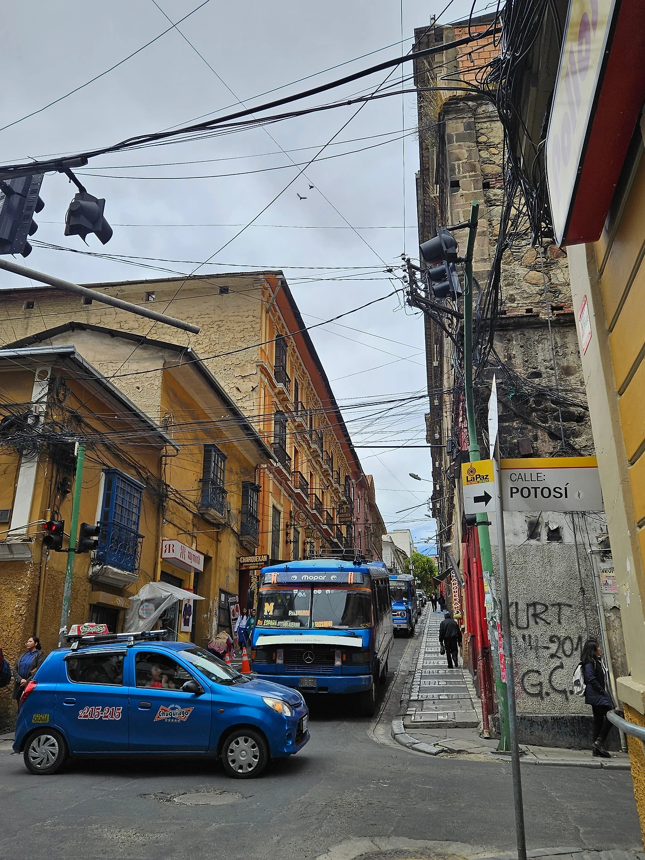 오후 3시가 되어서야 돌아다닐 마음이 생겼다. 과제 제출기한이 닥쳐야만 노트북 뚜껑을 여는 것과 같은 이치랄까. 목적지는 라파즈의 대표 관광지 마녀시장. 마녀시장까지는 걸어서 대충 20분 거리. 조금 돌아가더라도 일부러 큰 길이 아닌 작은 골목들을 타고 가면 차, 소음, 매연 뒤에 숨겨진 라파즈의 진짜 모습을 만날 수 있다. 소란스럽고 정신 없었던 라파즈의 첫인상 뒤에 숨겨진 조금 한적한 풍경들이 여행자의 발걸음이 자꾸 늦추었다. 빨간색, 파란색, 노란색, 가지각색의 자동차들, 마구 녈부러진 전깃줄 뭉치, 오만가지 낙서로 가득한 건물 외벽이 묘하게 아름다운 조화를 이루고 있었다.
