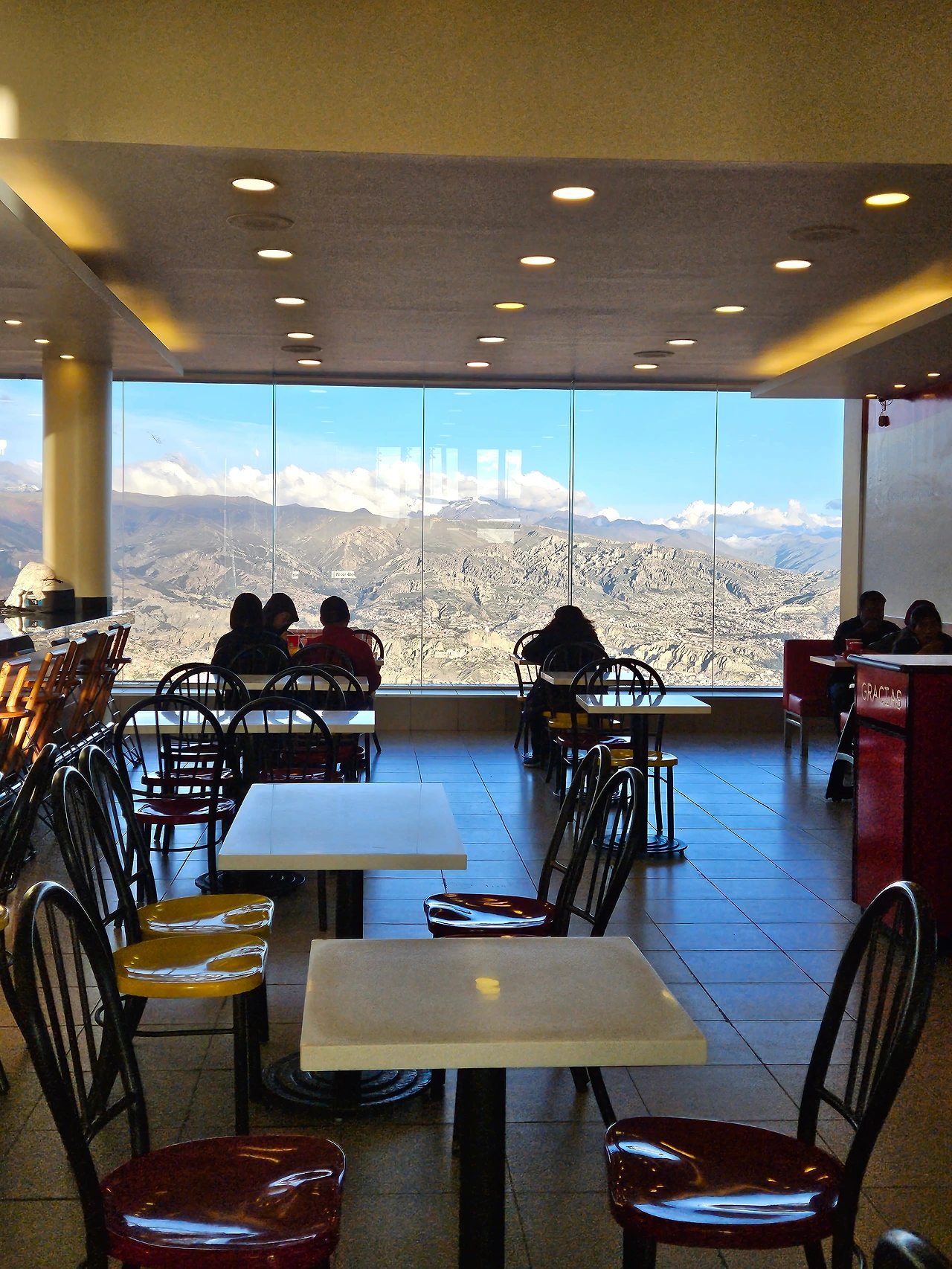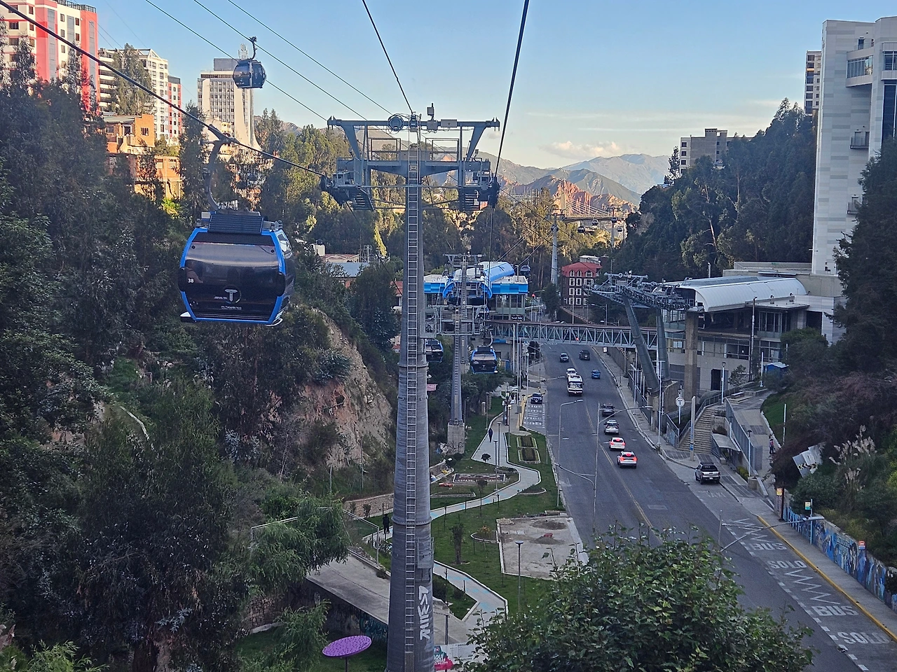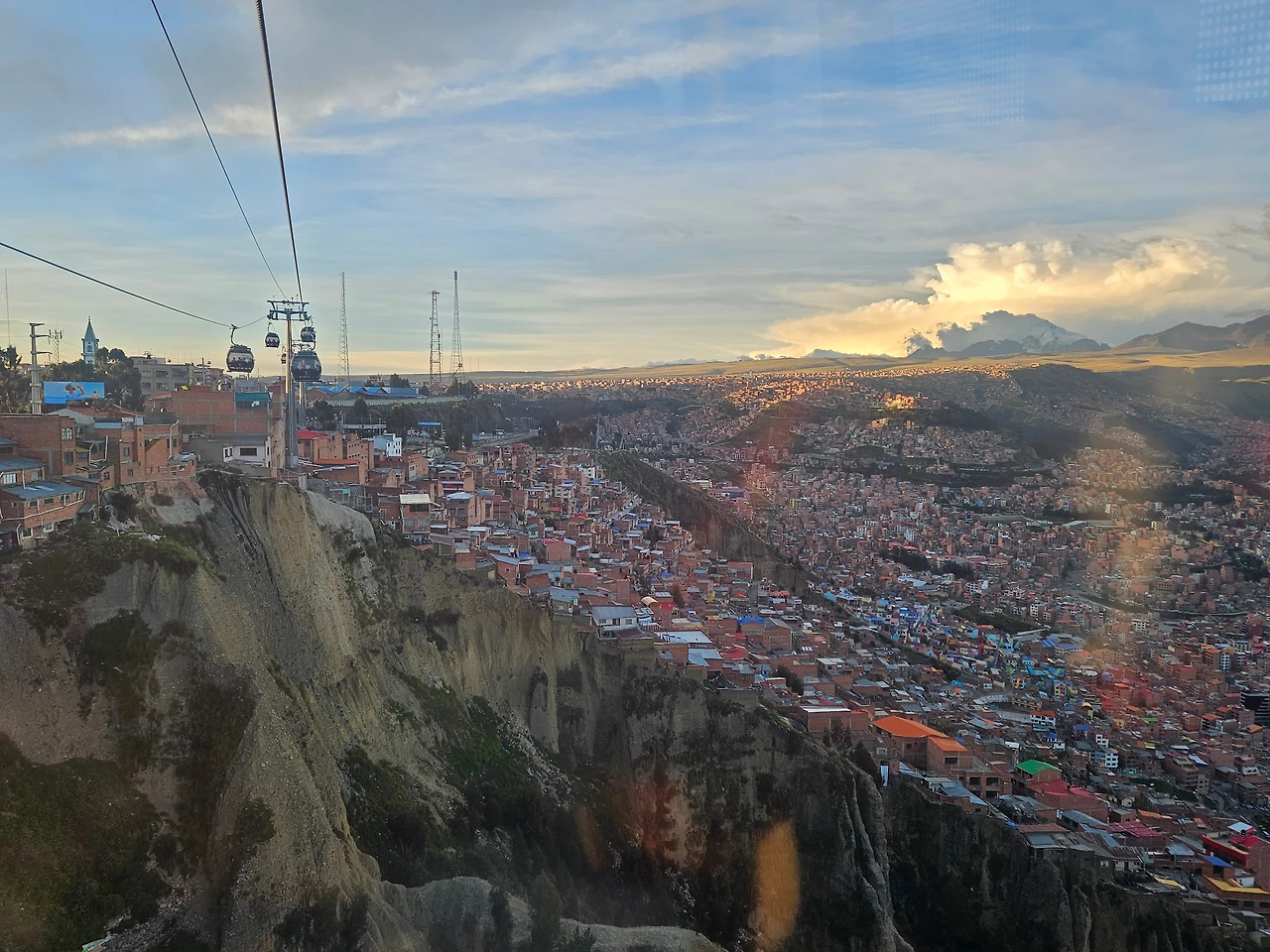 이 노선의 또다른 장관은 저멀리 보이는 안데스 산맥의 설산이다. 설산이 구름에 가려져서 숨었다 나타났다를 반복했다. 이 노선 구간에서는 사진이 별로 없다. 케이블카에서 사진을 찍고 싶다면 케이블카 진행 방향 쪽에 앉아야 오히려 역방향이더라도 고개만 돌려 경치도 가까이서 볼 수 있고, 유리창에 카메라를 대고 사진도 찍을 수 있다. 급한 마음에 남아 있는 자리에 그냥 앉았는데 정방향이라 편하긴 했지만 정면에 마주보고 앉은 사람들이 경치를 가려서(+ 그들을 면전에 두고 카메라를 들이대기도 미안해서) 사진을 찍지 못했다.