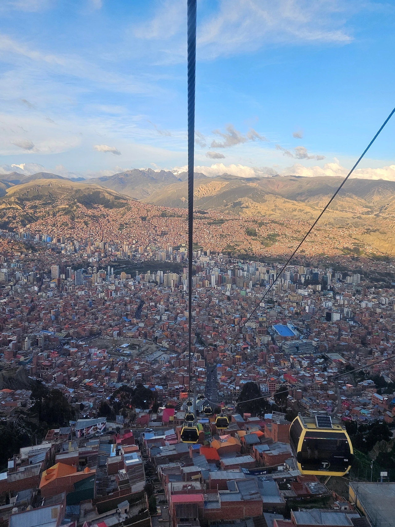 이어지는 하이라이트는 바로 롤러코스터 구간! 급격한 경사로를 따라 케이블카들이 줄지어 급 하강하기 시작했다. 롤러코스터가 따로 없었다. 놀이기구 기능까지 탑재한 이 케이블카는 정말 혁명적인 여행 수단이다. 그리고 눈 앞에 펼쳐지는 소름 돋는 파노라마 뷰는 입이 떡 벌어지게 만들었다. 하늘, 구름, 산, 그리고 점묘화처럼 촘촘히 박힌 집들까지, 그냥 예술 그 자체였다. 그 위로 줄지어 내려가는 노란 케이블카 행렬은 또 어찌나 귀여운지, 별 기대 없이 들른 환승 도시에서 갑자기 마음이 설레기 시작했다. 라파즈에 오길 참 잘했다. 케이블카를 타러 오길 참 잘했다.