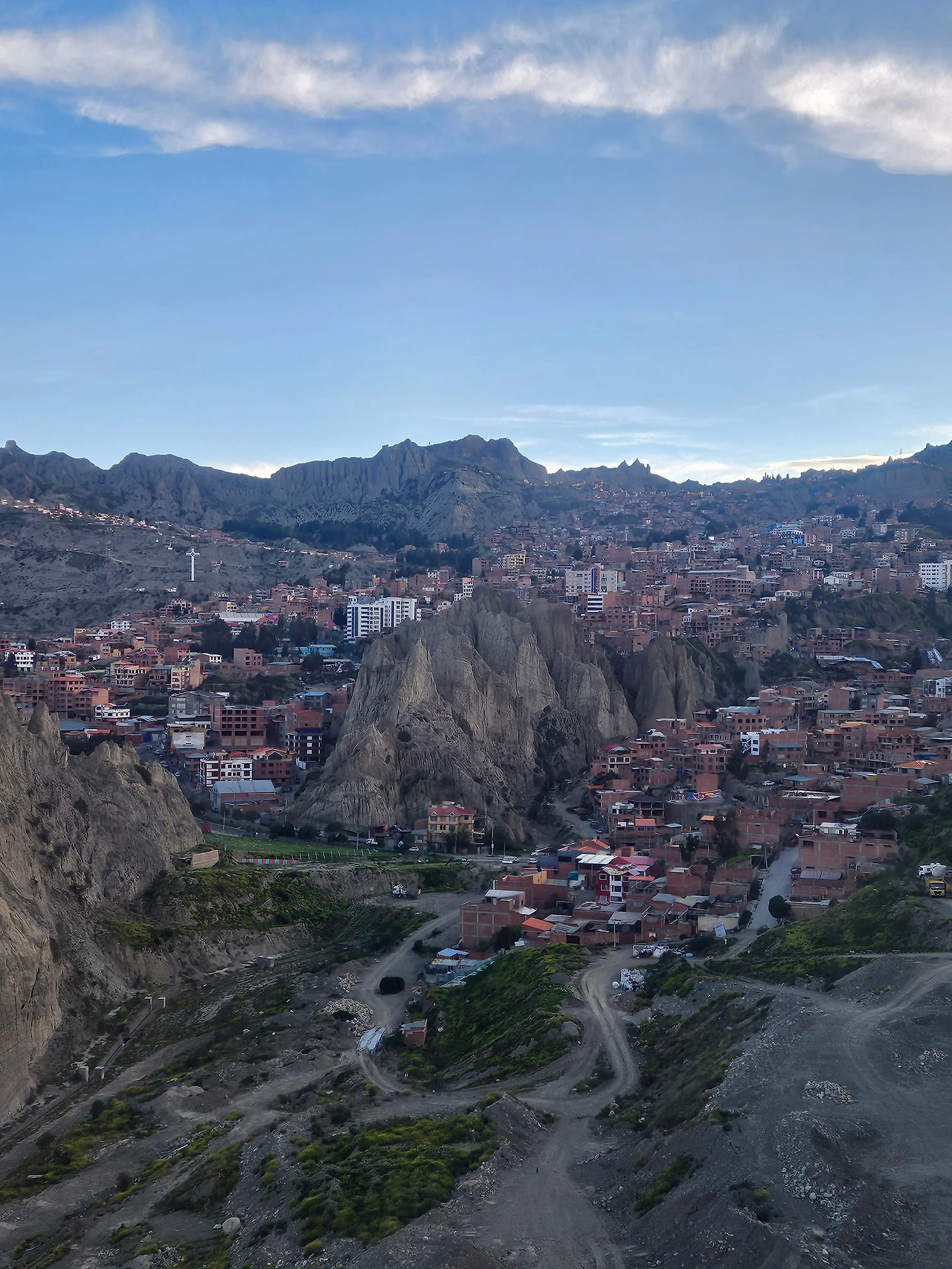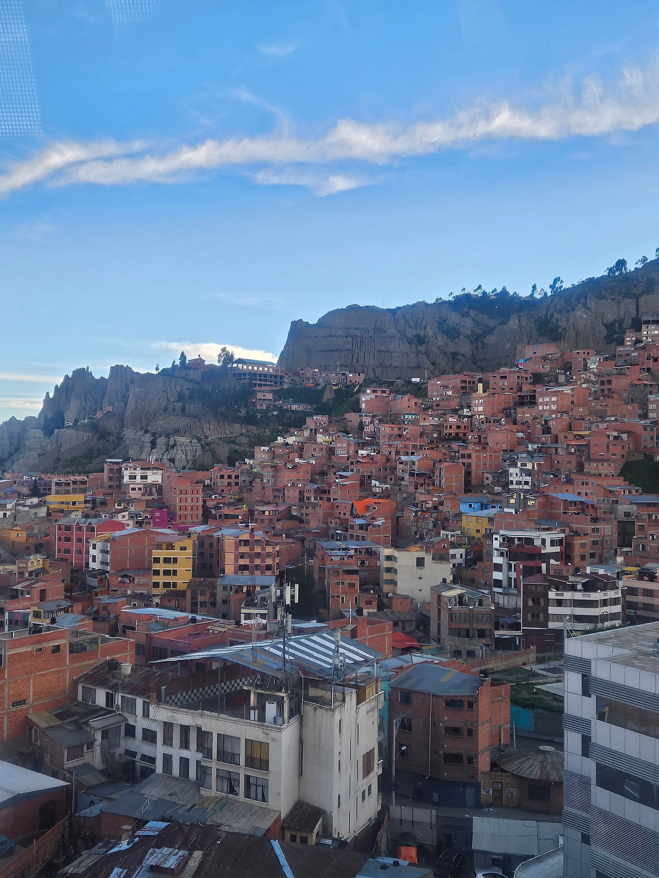 다행히 기다렸던 역 이름이 나왔다. 그제서야 마음을 놓고 라파즈 공중 관광에 몰입할 수 있었다. 마침 눈 앞에 외계 행성에 온 것 같은 독특한 지형과 그 사이사이를 가득 채운 벽돌색 주택들이 만들어낸 드라마틱한 뷰가 펼쳐졌다. 라파즈 중심부와는 전혀 다른 이국적인 모습이었다.