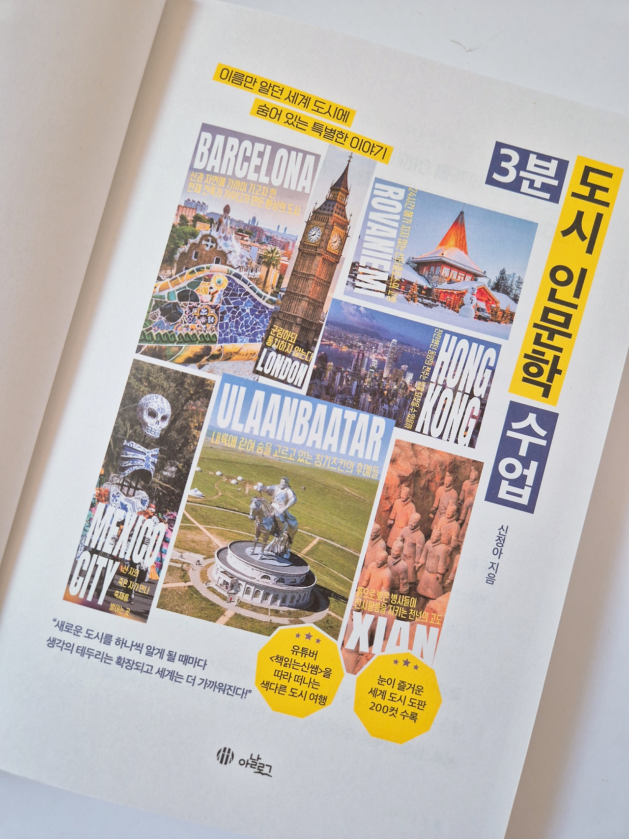 신정아 작가의 <3분 도시 인문학 수업>은 40개의 도시 이야기를 통해 독자들에게 세계 여행의 기쁨을 선사하는 훌륭한 교양서이다. 이 책은 5장으로 나뉘어 있어 각 도시의 매력을 선명한 이미지와 이해하기 쉬운 설명으로 전달한다.