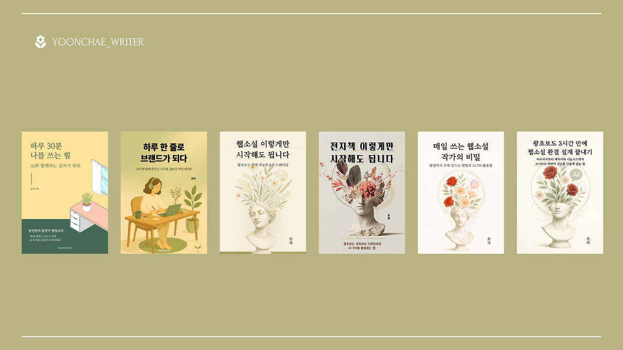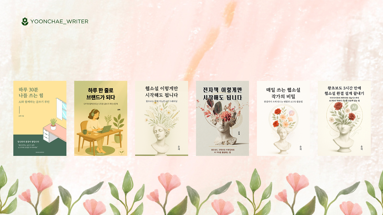 돌아보면 여섯 권의 전자책은 화려한 비법으로 완성된 것이 아니다. 좋아하는 것을 붙잡고, 매일 조금씩 쓰고, 완벽에서 내려오고 몸과 마음을 돌보는 아주 사소한 일들의 반복이었다.