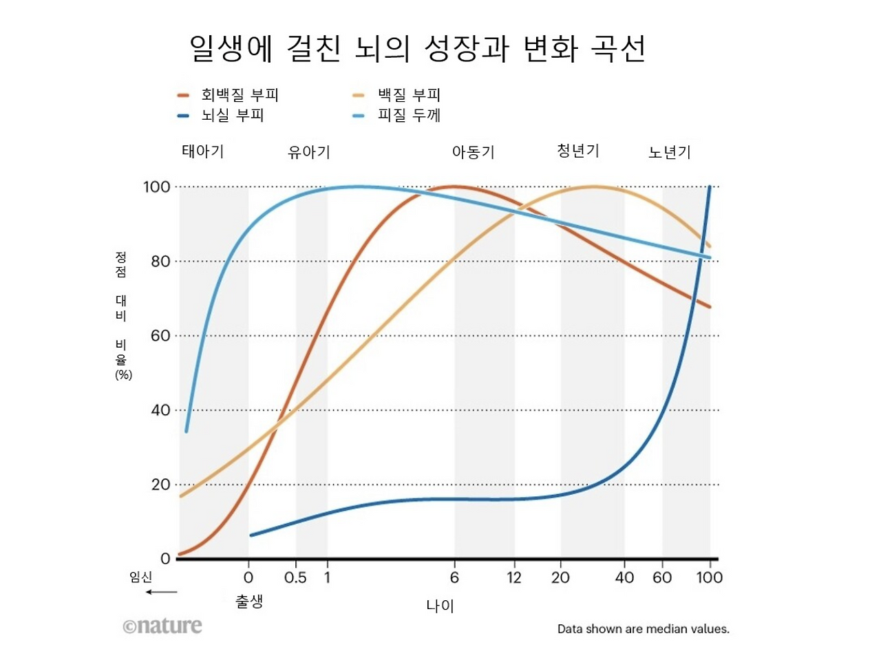 연구에 따르면 일반적으로 뇌는 생후 약 4개월부터 3살까지 가장 빠른 속도로 성장한다. 뇌의 표면적은 11살 무렵에, 대뇌 용적은 12.5살에 정점을 찍는다. 백질 부피는 29세 직전(28.7세)에 정점을 찍는다. 신체 기능과 기본 행동 패턴을 관장하는 피질하부 회백질은 14.4살에 정점에 이른다.
