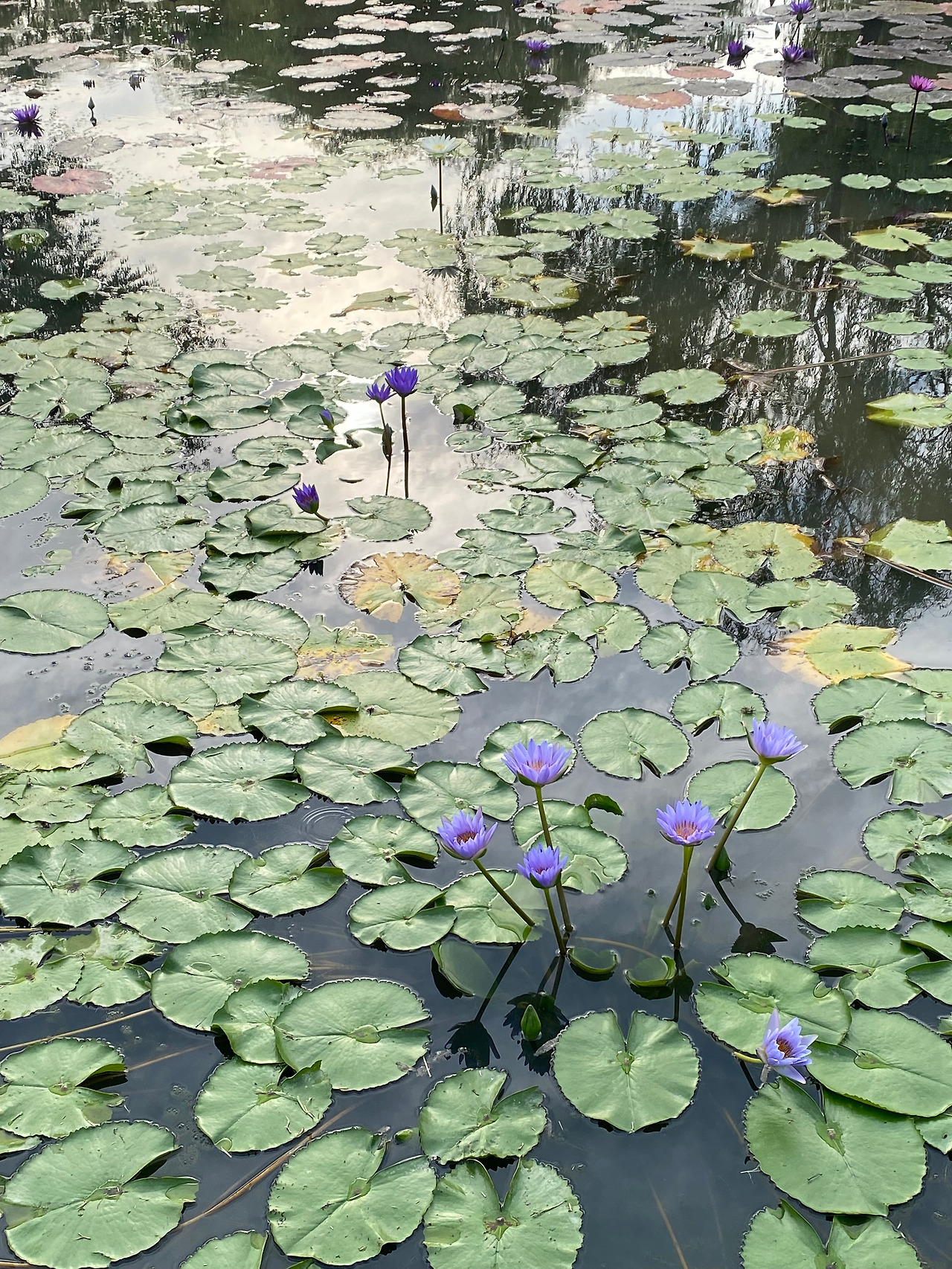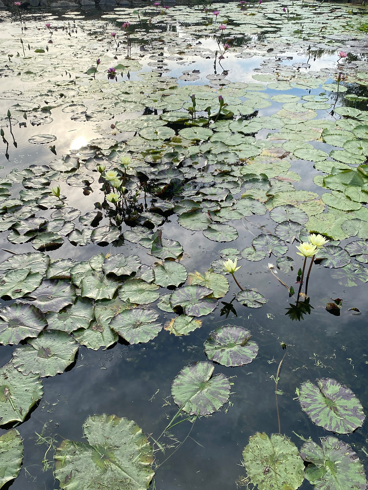 연꽃잎은 너무나 커서 물을 가리지만, 수련 잎 사이로는 하늘과 구름이 보인다.