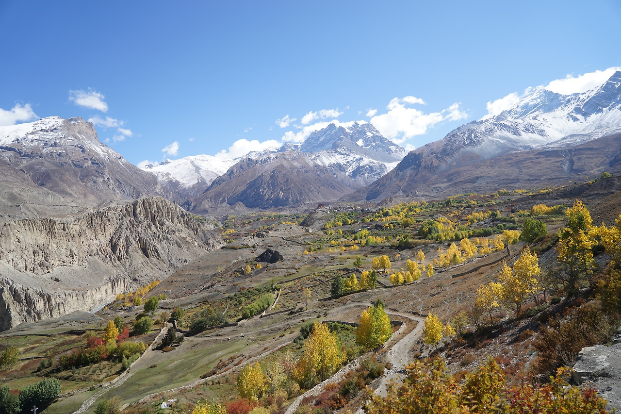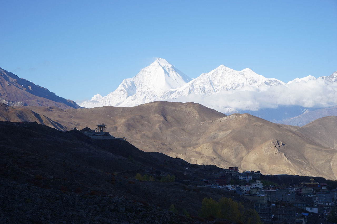 묵티나트에서 자르콧으로 내려오는 길은 오른편으로 어퍼무스탕 영역의 황량한 풍경이 펼쳐지는 환상적인 길이다. 히말라야 특유의 황량함은 어디든지 있지만 그것과 더불어 끝없이 펼쳐진 대지가 주는 느낌은 많은 것을 생각해보게 한다. 계곡을 기점으로 왜 무스탕 쪽으로는 수목이 자라지 않는가를 물어보니 온도차이 때문이라고. 뒤를 바라보니 묵티나트의 모습이 멀리 바라보였다. 안나푸르나를 배경으로 그림 같은 풍경을 자랑하는 곳이다.