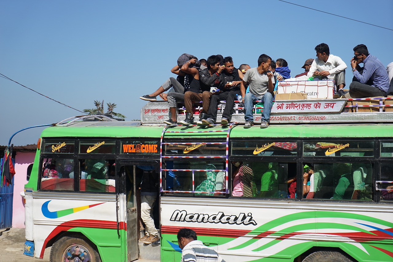 버스가 준비되어 올라타 자리에 앉으며 이 특유의 인도식 페인팅이 칠해진 버스에 큰 기대를 하지 않았지만 웬걸 와이파이가 가능하다고 적혀있다. USB를 통한 충전 역시 가능하다. 센세이션 한 느낌. 백인 여행객 몇 명이 버스에 오르고 옥탑에 짐을 가득 채운 버스는 자리가 모자라 복도까지 짐을 채운다. 후에 타는 네팔리들은 짐 위로 건너가느라 난리판이 벌어진다. 결국 버스는 더 넣을 수 없는 상태가 돼서야 준비를 마친다.