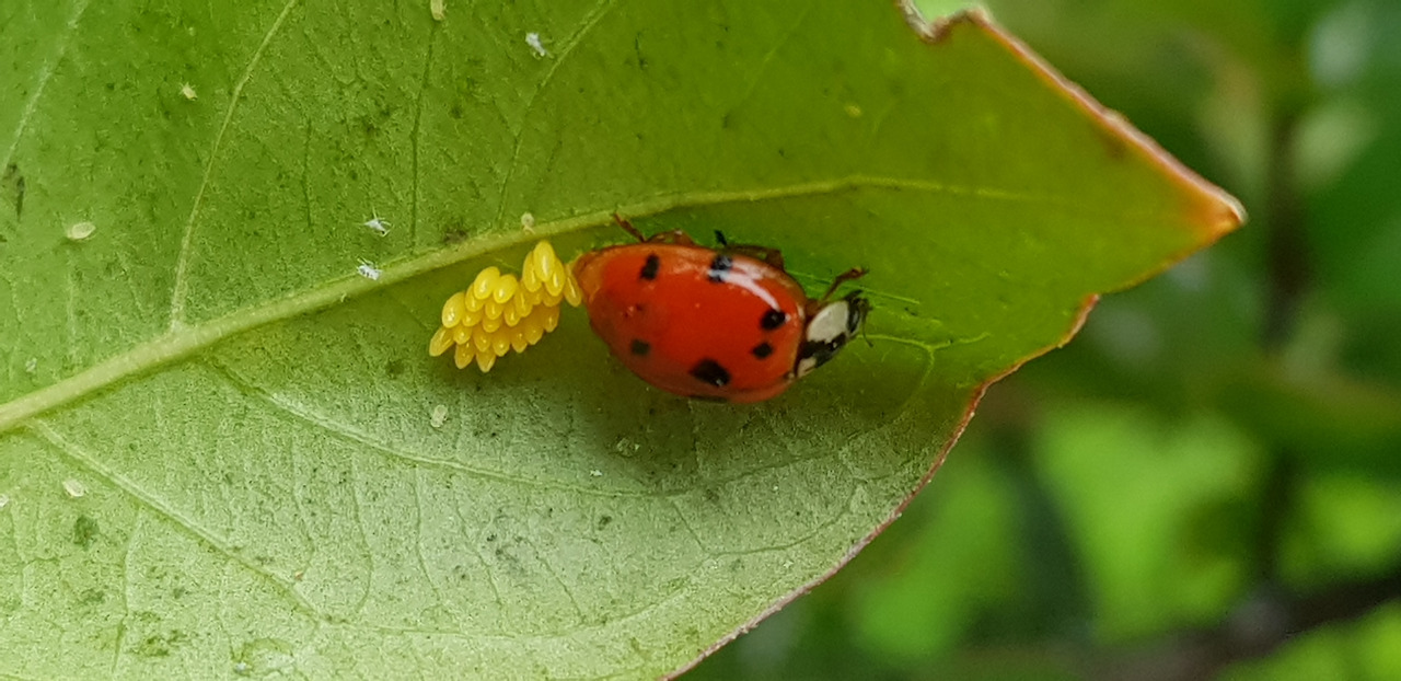 한 여름 햇볕의 힘이 얼마나 강한지를 제대로 보여주듯 따가운 햇빛이 내리쬐는 오전 10시쯤 도심공원에 있는 배롱나무 잎사귀 뒷면에서 알을 낳고 있는 무당벌레를 목격했다. 노랗고 길쭉하며 반짝이는 알을 하나씩 하나씩 낳아 붙이고, 앞으로 나아가며 또 낳아 차례대로 붙이는 산고의 시간은 삼십 분이 훌쩍 넘는 동안 계속되었다. 내리쬐는 한여름 햇볕이 어찌나 강한지 머리가 빙~하고 돌 정도로 땀을 줄줄 흘리며 30여 분을 지켜보다가 나는 그만 포기하고 그 자리를 벗어났다.