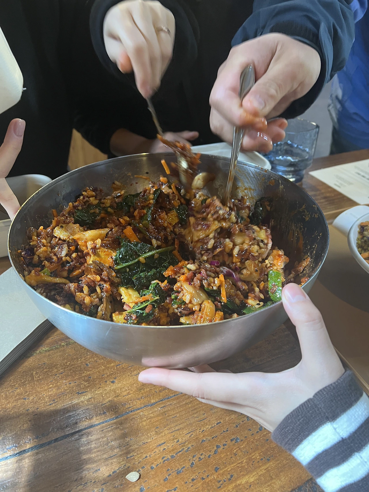 숟가락에 크게 한 입 떠 넣자 고소한 참기름과 매콤한 고추장의 풍미가 부드럽게 어우러졌다. 퀴노아에 섞인 밥알이 한국 쌀과는 달라 전형적인 비빔밥 맛과는 조금 달랐지만, 참기름과 고추장이 그 맛을 잘 잡아주었다. 다들 양푼에서 비빔밥을 자기 그릇에 덜어가는 모습을 보니 마치 중학생 시절 친구들과 커다란 그릇에 빙수를 만들어 함께 퍼먹던 기억이 문득 떠올랐다.