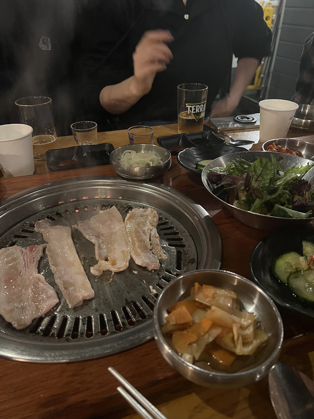 음식을 여러 가지 시켰지만 양이 조금 적어서인지 두 분이 2차 갈 생각 없냐며, 여기서 먹은 음식값은 본인들이 계산하겠다고 하셨다. 우리는 한사코 사양했지만 계속 거절하는 것도 예의가 아닌 것 같아 대신 2차는 우리가 계산하겠다고 말씀드리고 한식당으로 갔다. 불판 위에 삼겹살을 올린 뒤 지헌 누나가 기가 막히게 말아 주신 소맥을 마시며 김치찌개와 해물파전을 먹었다.