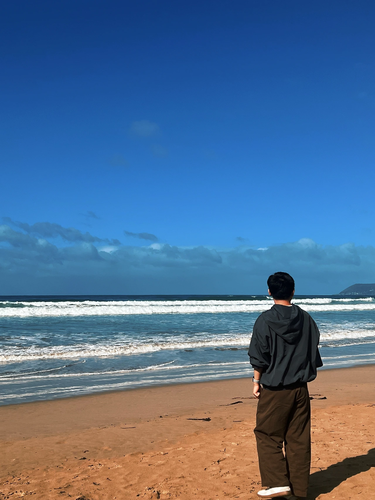 비가 그친 뒤 도착한 론 비치는 바다가 놀라울 만큼 투명하고 파랬다. 이른 시간이라 그런지 해변은 한산했고, 우리는 강아지와 산책을 즐기던 견주를 멀리서 바라보며 시간을 보냈다. 해변을 둘러보다 보니 뒤편에 부부 두 분이 계셨고, 여행의 좋은 추억을 많이 남기시면 좋겠다는 마음에 먼저 다가가 사진을 찍어드렸다.