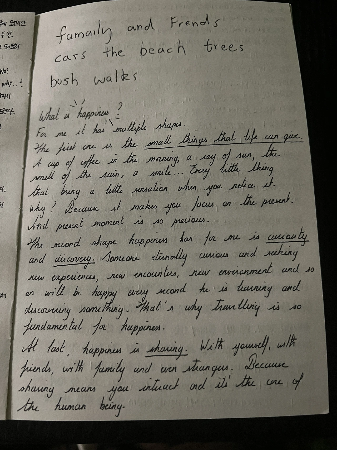 이 글을 읽은 순간 마치 머리를 한 대 얻어맞은 듯한 충격이 왔다. 군대에 있을 때 나는 행복이란 쉽게 가질 수 없는 것이라고 생각했다. 하지만 여행을 하면서 깨달았다. 행복은 거창한 사건이 아니라, 카밀이 말한 것처럼 일상 속에 숨어있는 작은 순간들이라는 것을. 그래서 카밀이 써준 행복을 읽었을 때 나와 똑같은 생각을 하고 있다는 점이 신기하게 느껴졌다.