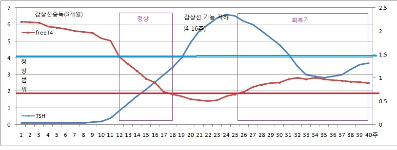 약물 치료를 하지 않은 아급성 갑상선염으로 일시적인 갑상선 기능 항진증과 저하증(그림 3)이 발생한 경우에 6-8주의 평행상태(정상이나, 회복기 중)에 도달하기 전 시행한 갑상선 기능 검사는 일반적으로 나타나는 TSH-유리 T4의 역의 상관관계가 성립하지 않을 수 있습니다. 예를 들면 유리 T4가 증가되어 있는데, TSH는 정상이라던지, 유리 T4가 정상인데 TSH가 낮은 경우들이 발생할 수 있습니다.