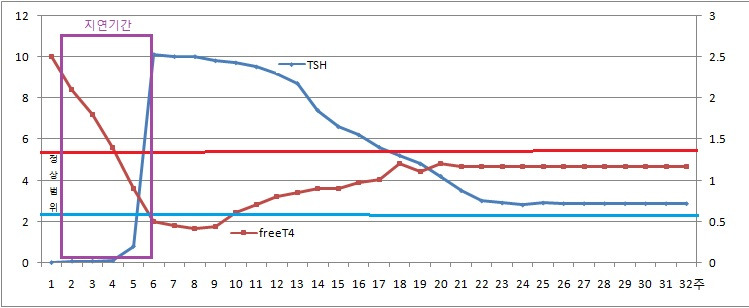 그리고 이러한 지연 반응은 갑상선 기능 저하증 환자에서도 나타나는데, 갑상선 기능 저하증에서 약물 치료 시 TSH의 변화는 제1기 급격한 TSH 억제시기로 1시간 안에 이루어지고, 제2기 억제가 서서히 진행하는 시기로 10-20시간 사이에 시작하여 6-8주간 지속되고, 제3시기는 낮은 농도의 TSH (<0.01 µIU/mL)가 유지되는 시기로 구분됩니다. 즉 갑상선 기능 저하증에서도 6-8주의 숙려기간이 필요합니다.