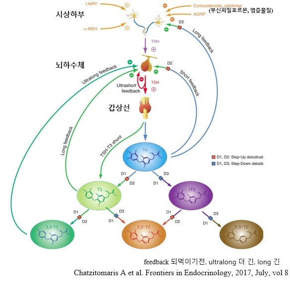 또한, 갑상선 기능이 외부환경에 의해 새로운 평형에 도달할 수 있는데 (이를 allostasis라고 함), 이로 인해 갑상선 기능이 표 1과 달리 TSH와 유리 T4가 역의 상관관계를 보이지 않아 갑상선 기능 평가에 어려움이 있을 수 도 있습니다. 알로스테시스(allostasis)는 유형 1(type 1)과 유형 2(type2)로 나뉠 수 있습니다. 유형 1은 유리 T3 감소(deiodinease 1/2 down regulation), 유리 T4 감소 또는 정상, TSH 감소 또는 정상(TSH 분비 감소), 유형 2는 유리 T3증가( deiodinase 1/2 up regulation), 유리 T4 증가 또는 정상, TSH 증가 또는 정상 (TSH 분비 증가)의 소견을 보입니다. 유형 1은 태아 시기, 금식, 과도한 운동, 우울증, 정상 갑상선 기능성 질병증후군(euthyroid sick syndrome), 약제 (스테로이드), 등이 있으며, 유형 2에는 임신, 과식, 비만, 높은 고도, 적당한 운동, 추위, 급성정신증 (acute psychosis), 외상 후 스트레스 장애 (post-traumatic stress syndrome), 약제 등이 있습니다.