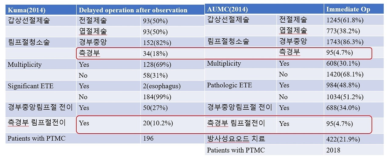 수술적 치료와 방사성 요오드 치료를 예를 들어보겠습니다. 일본은 방사성 물질에 대한 구제가 엄격하여 방사성요오드 치료를 많이 하지 않습니다, 그러다 보니, 측경부 림프절 절제술을 우리나라나 서양보다 많이 합니다. 측경부 림프절 전이가 술 전에 발견되어 그렇게 하는 것은 아닙니다. 일본의 쿠마 병원에서는 7.2%는 예방적 목적으로 시행한 겁니다 (표2, Thyroid,2014;24(1):27-34, J Korean Med Sci,2014,29:48-52). 우리나라나 미국의 가이드라인에서는 예방적 목적으로 측경부 림프절 절제술을 하지 않도록 권고하고 있습니다. 그리고, 첫 수술 시 림프절 전이를 확인하기 위해 경부 중앙부위뿐만 아니라, 측경부의 제3구획의 림프절도 일부 제거합니다.