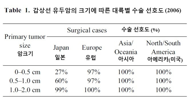 그리고 이런 지켜보는 방법이 가능한 것은 나라마다 다른 치료법, 즉 다양성에서 기인한다고 할 수 있습니다. 일본은 전절제술보다는 엽절제술을, 수술하는 것보다는 지켜보는 분위기가 대세인 나라입니다. 한 논문(Endocrine Journal,2006;53:829-839)에서 나라마다 수술 방법의 선호도를 알아보는 연구를 진행했습니다. 일본은 확실히 달랐습니다. 1cm 이하의 갑상선 유두암은 엽절제술이나 지켜보는 방법을 일본 의사들은 선호했고요, 미국 의사들은 엽절제술이나 전절제술을 선호했습니다(Table 1). 이러한 치료의 다양성은 서로 다른 나라 간의 교류로 우리나라에서도 갑상선암 치료의 변화를 불러왔습니다.