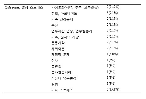 그러나 전향적 연구에서 첫 번째 난제인 인지 부조화는 두 번의 반복측정 만으로 해결이 되지 않았습니다. 그래서 TSH가 높았지만 스트레스가 없다고 해서 인지와 신체 반응(allostatic load)의 부조화가 있는 분들에서 진료 시에 개방형 질문(open ended question)으로 심층 면담 통해 스트레스 요인을 찾아야 했습니다. 그리고 다른 후향적 연구를 통해 보고한 내용으로 갑상선 수술을 받은 환자들에서 TSH가 상승하는 경우는 표 1과 같이 이사, 이직, 승진, 갈등, 질병, 경제적 문제, 가정문제, 자녀문제뿐만 아니라 봉사활동의 시작, 아르바이트 시작, 운동 시작 등 다양했습니다 (표 1)(Lee J, J Endocrin Surg. 2024.Mar;24(1):1-8).