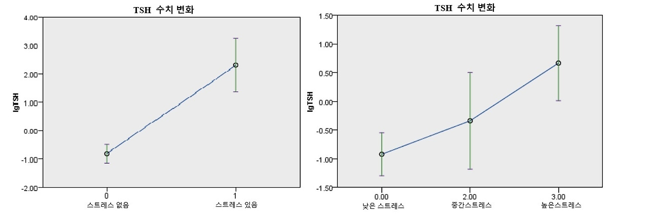 일상적인 스트레스가 갑상선에 미치는 영향을 조사하는 연구에서는 갑상선 전제술을 받았거나(58명), 엽절제술을 받았으나 갑상선염이 없는 환자들을(48명) 대상으로 하였습니다. 이연구에서 스트레스가 있은 경우에 TSH가 상승하였고, 설문지(SOSS)에서 스트레스가 낮은 경우보다는 스트레스가 높은 경우에 TSH수치가 높아짐을 확인할 수 있었습니다 (그림 3). 저자의 이 연구에서는 이런 결과를 얻을 수 있었던 것은 이미 연구 대상자들이 갑상선 수술을 받은 분으로 종결점 (endpoint)을 T3, T4( 갑상선 호르몬)과 되먹이 기전을 고려하지 않고 TSH로 만으로 할 수 있었기 때문에 스트레스가 갑상선 기능에 영향을 미친다는 것을 증명할 수 있었습니다.