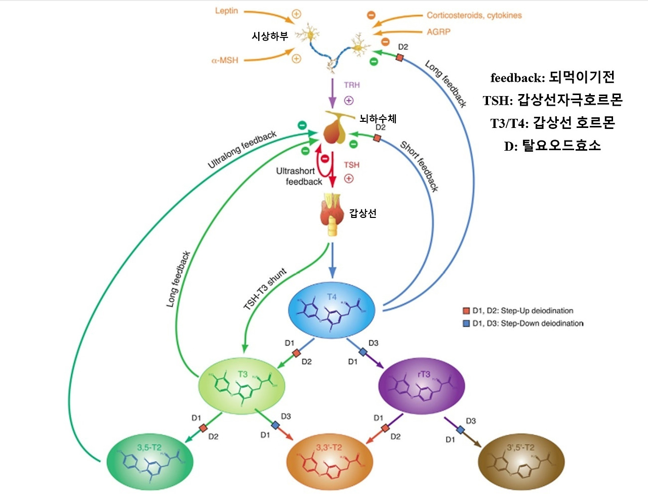 갑상선은 갑상선 호르몬(T3, T4)을 생성하고 분비하는 내분비 기관입니다. 갑상선 호르몬은 신체의 모든 기관에 영향을 미치는데 머리카락의 탄력 및 회전주기부터 간세포의 성장과 하루하루의 기분까지 광범위합니다. 그리고 갑상선호르몬은 갑상선자극호르몬(뇌하수체호르몬)에 의해서 조절되고 분비된 갑상선호르몬은 뇌하수체에서 갑상선 자극 호르몬이 과도하게 분비되지 않도록 억제합니다 (되먹이 기전). 또한 시상하부에서 비만, 염증물질 등에 의해 미세하게 조정됩니다. (그림 1)