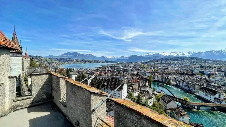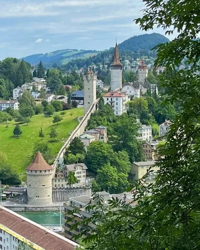 강가를 따라 상가들을 지나 언덕으로 힘겹게 올라가니 둥그런 원통의 성곽초소가 육중하게 자리 잡고 있고 조금 더 올라가니 루체른시가 한눈에 들어왔다.