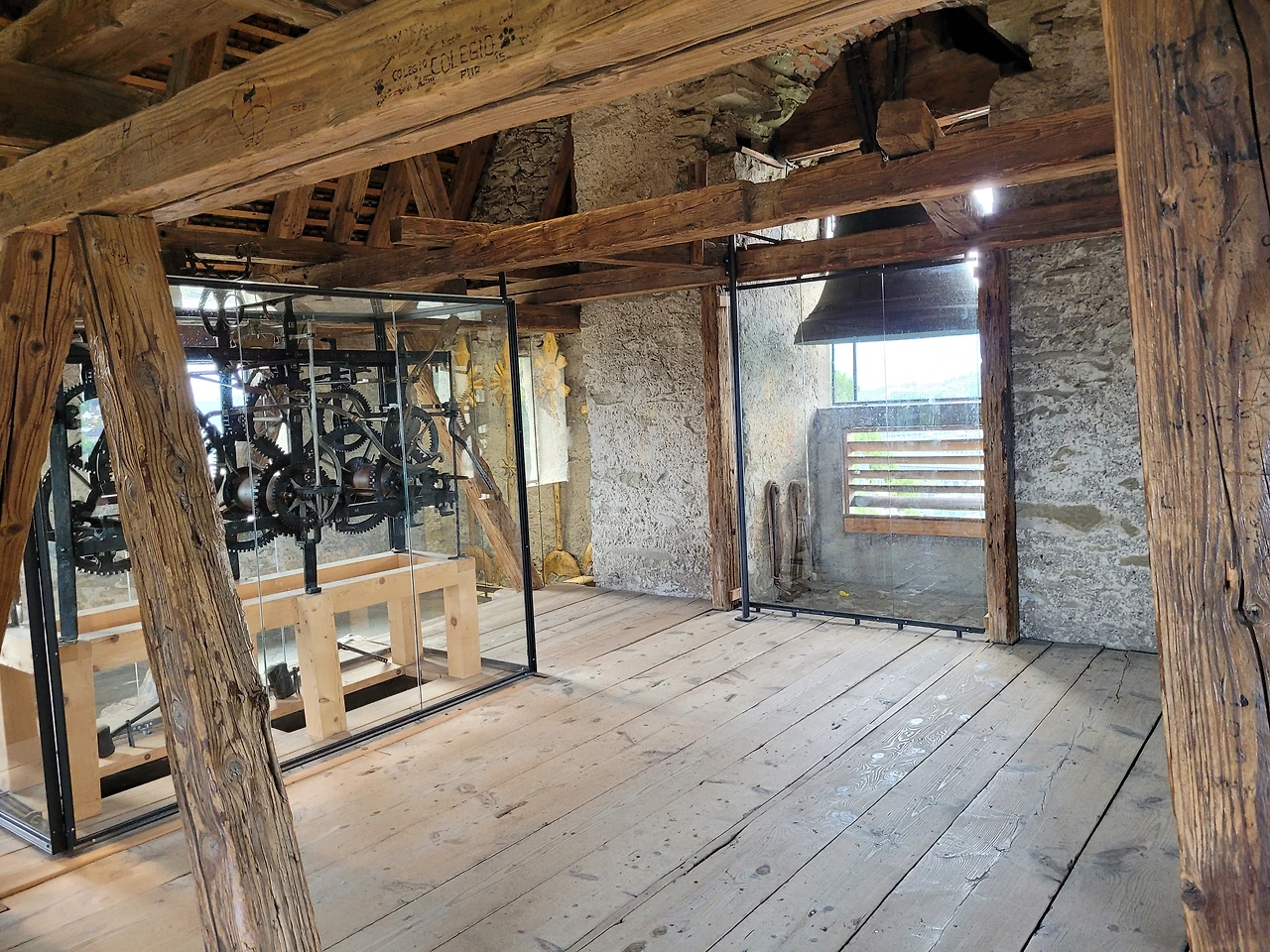 그리 넓지 않은 정사각 석벽 방, 아래위로 뚫린 공간에 목조구조물이 설치되어 있고 그 안에 커다란 트럭 엔진처럼 생긴 기계구조물이 있는데 바로 시계인 것이다.