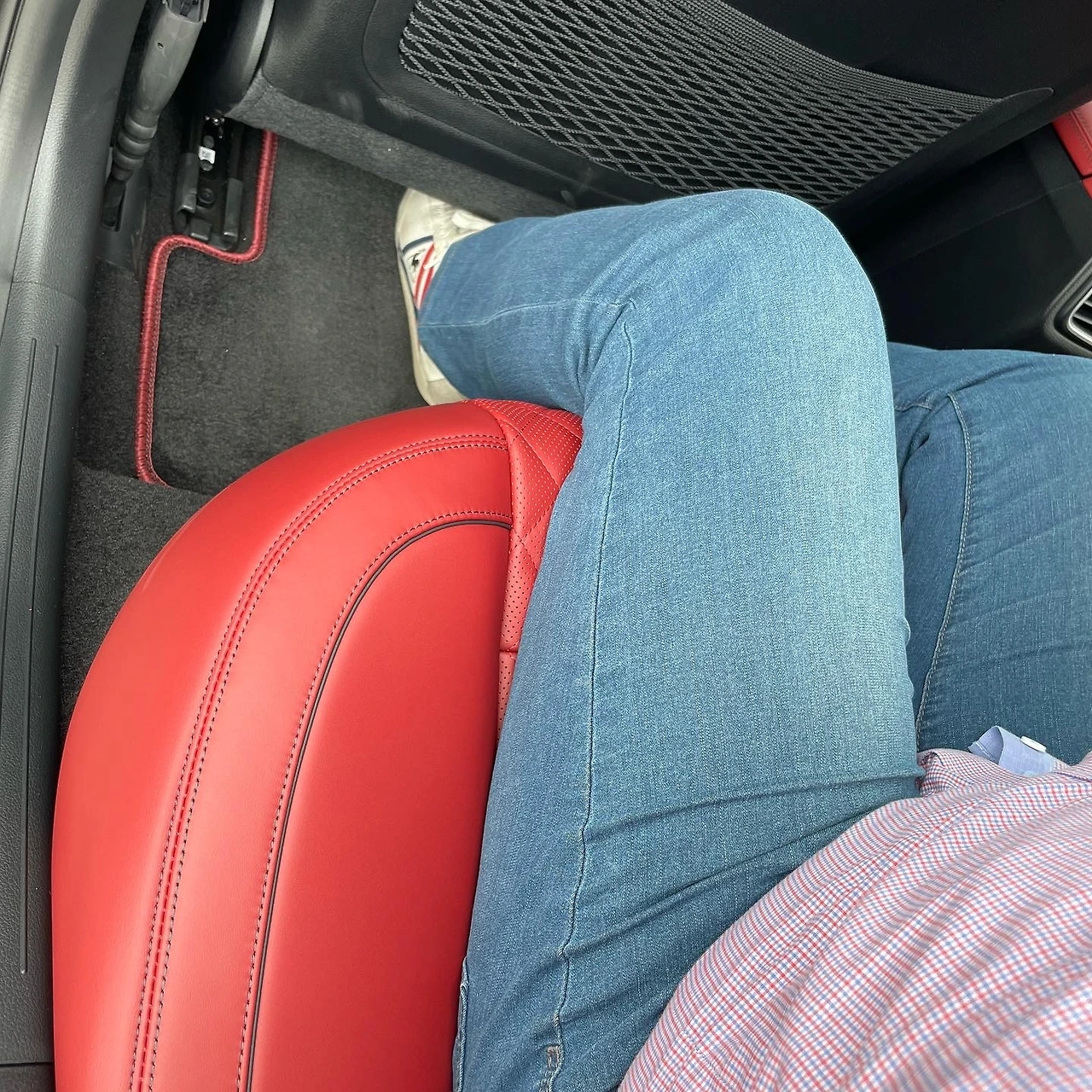 다리 공간은 제가 운전석에서 포지션을 잡은 것 기준으로 나쁘지 않습니다. 이번에 다시 확인했는데, 1열 시트를 맨 아래까지 내리면 쿠션 앞부분이 조금 올라와 뒤로 기울어진 상태가 됩니다. 이걸 수평을 맞추기 위해 뒤쪽을 2cm 정도만 올리면 사진처럼 발이 쏙 들어가고 편한 자세가 됩니다.