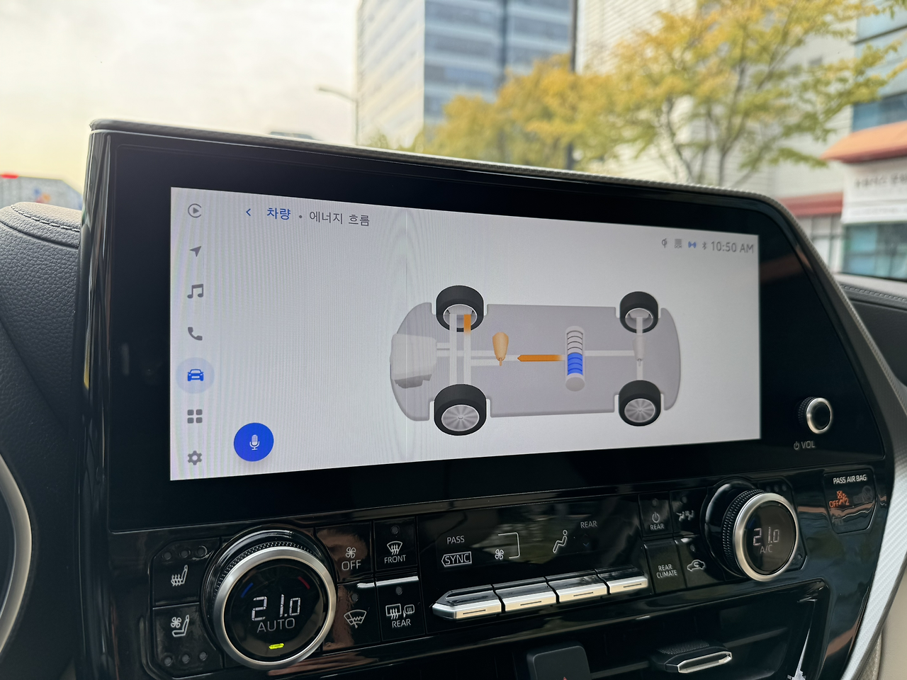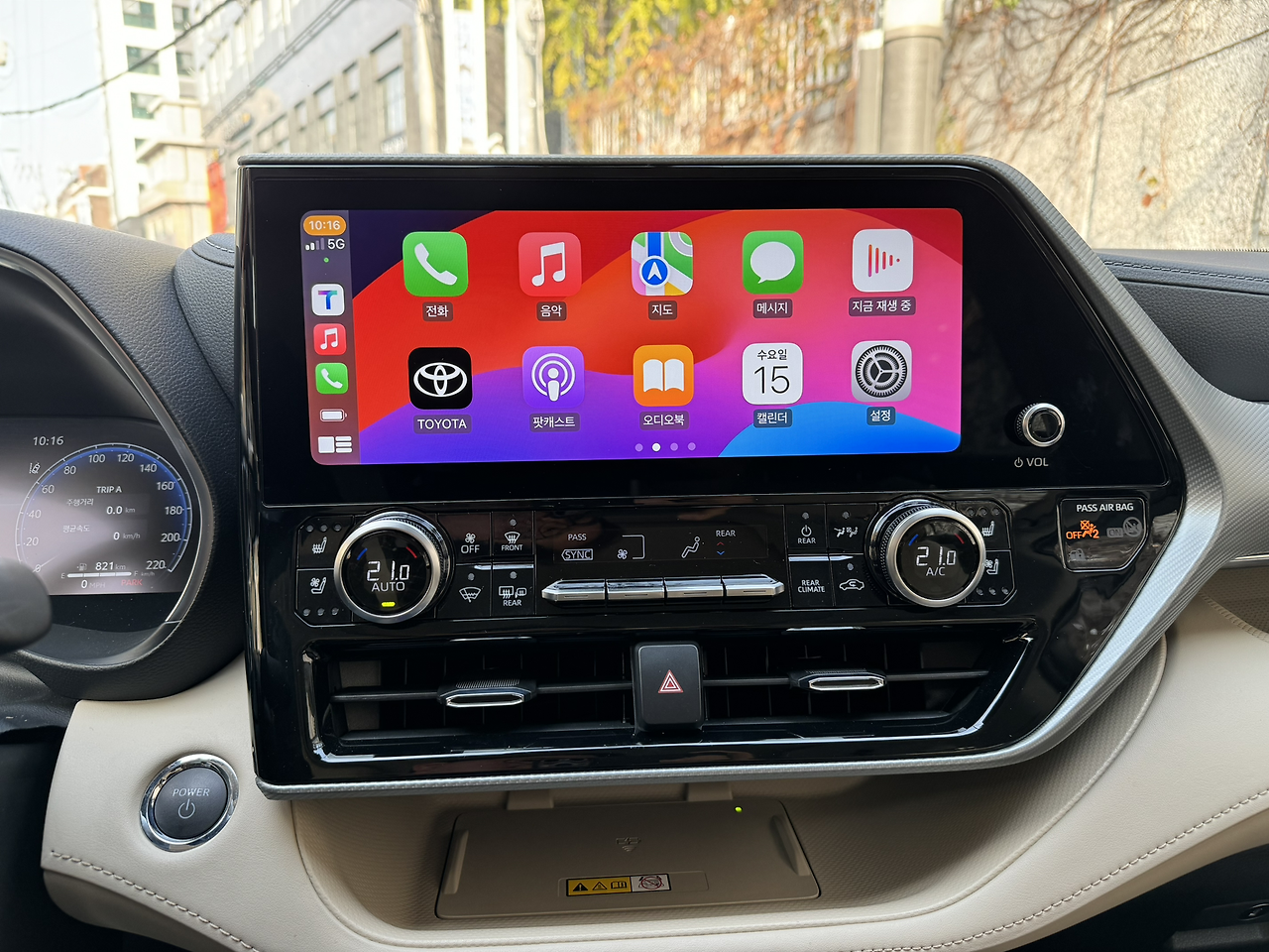 조작성은 좀 아쉽습니다. 오디오 전원 및 볼륨 버튼이 뜬금없는 위치의 운전석에서 가장 먼 데 있는 것이 그렇습니다. 또 차 기능이나 내비게이션 조절을 물리적 스위치 없이 모두 터치스크린에서만 합니다. 그러다 보니 전체 화면으로 실행되는 무선 애플 카플레이에서 차의 기본 내비게이션이나 오디오 화면으로 돌아가기가 번거롭습니다. 카플레이 화면의 토요타 앱을 누르거나, 네이버 클로바 음성 명령으로 ‘지도 화면 보여줘’ 등을 말해 전환해야 하는 거죠.