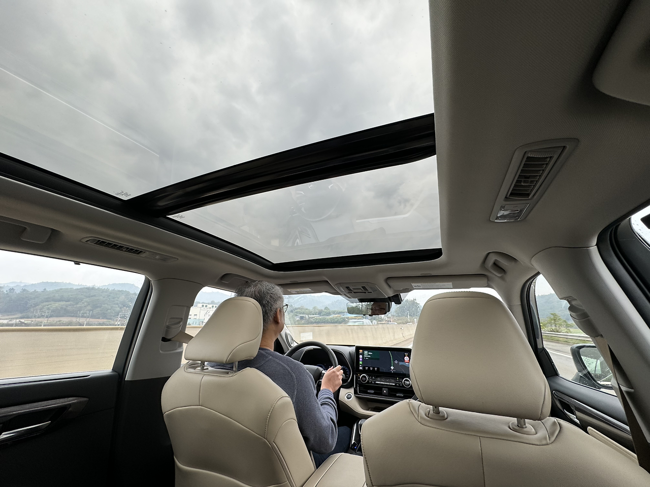 2열은 천장 공기배출구로 헤드룸을 살짝 손해 보는 느낌인데, 파노라마 선루프가 1/2열이 다 열려 개방감이 좋습니다.