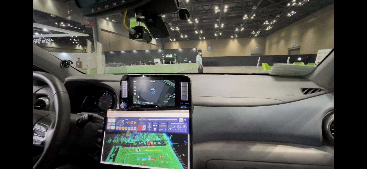 코나EV를 바탕으로 만들어진 로보택시는, 사전 매핑을 통해 정해진 코스를 운행합니다. 그 중간에 장애물이 나오면 종류를 인지하고 피해 가거나, 보행자가 경로에 들어온 경우 일단 멈추고, 거리가 멀어지면 일정한 간격을 두고 쫓아 갑니다. 경로에서 완전히 벗어나야 주행을 다시 시작합니다.