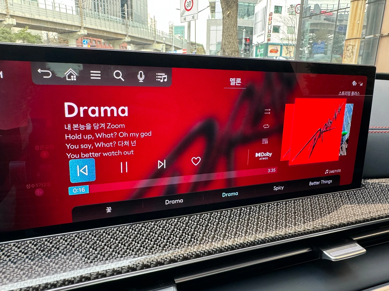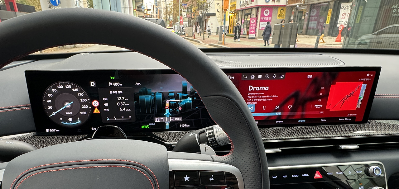 이 사진은 이번 페이스리프트에서 더해진 27인치 OLED 스크린입니다. 맨 위처럼 오른쪽에 넓게 내비게이션 지도를 보다가 현재 재생하는 미디어를 부르면 아래 사진처럼 지도가 왼쪽으로 움직여 작게 축소되어 나타납니다.