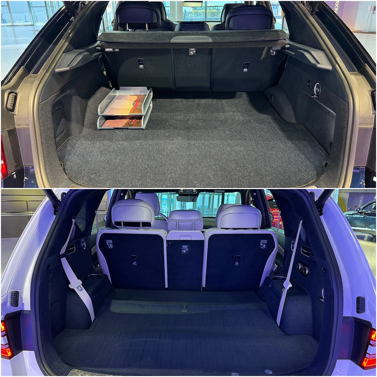사진은 쿠페(위)와 7인승 GV80 SUV의 트렁크 비교입니다. 제 기억에 SUV 5인승은 사진의 컵홀더와 안전벨트 등이 빠지면서 뒷바퀴 휠하우스가 더 낮았던 것 같은데요, 쿠페는 가능한 트렁크로 침입이 적도록 했습니다. 물론 SUV보다 5인승 기준으로 20% 정도는 줄어들지 않을까 싶습니다. 지붕선이 낮으니까요.