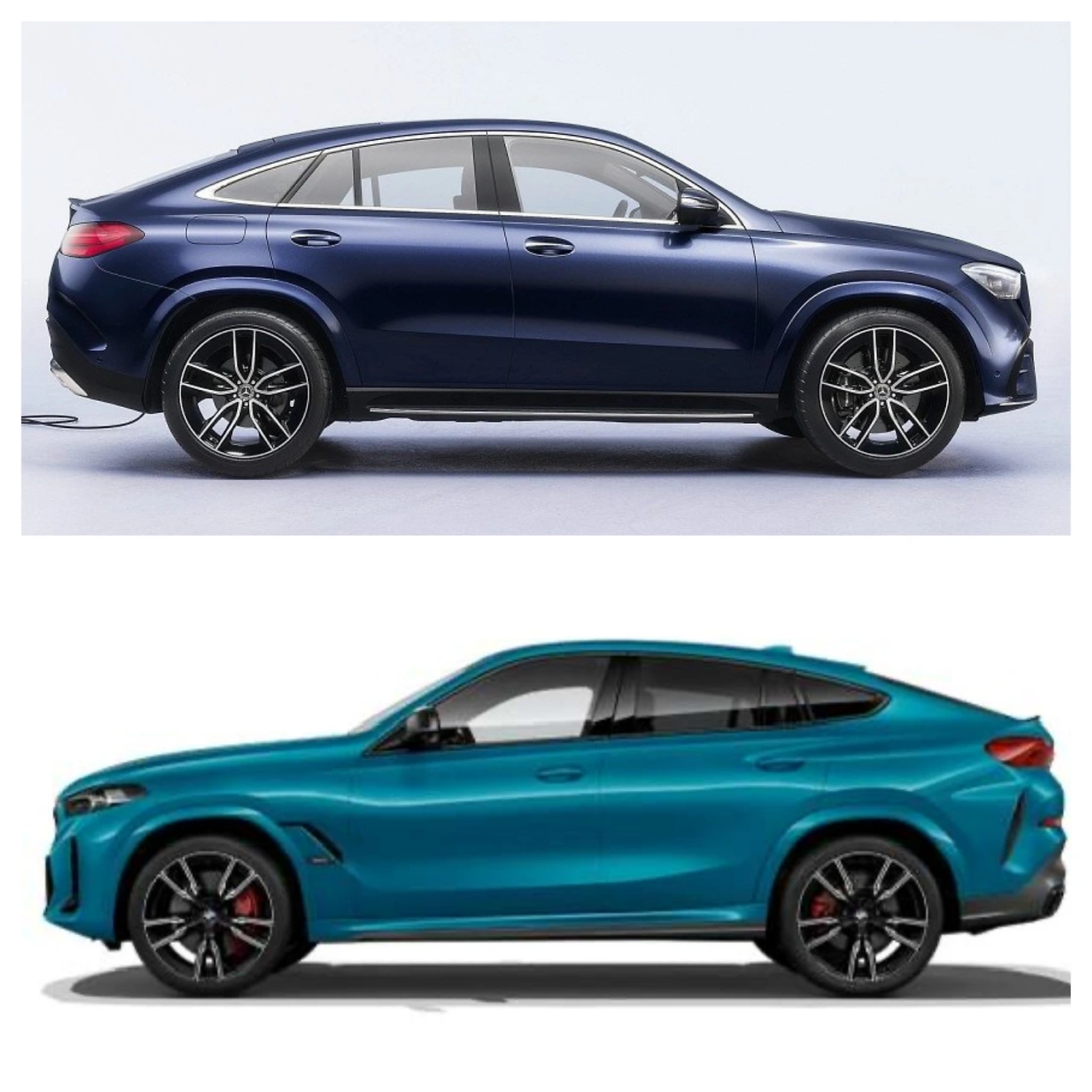 두 차 모두 옆 유리를 뒤쪽으로 길게 빼면서 쿠페스럽게 만들었습니다. 특히 GLE는 트렁크 공간을 위해 길게 빼며 부풀어 오른 뒤쪽을 감추려고 윈도 끝을 거의 뒷바퀴 끝으로 당겼고, 이걸 노치백 쿠페처럼 마무리했습니다. X6는 날렵한 BMW의 패스트백 쿠페 라인인데 이걸 SUV에 넣느라 무리를 한 느낌입니다. 2열과 트렁크 공간 희생도 있고요. 개인적으로 쿠페형 SUV 디자인을 좋아하지 않는 건 이런 균형을 잡기가 쉽지 않아서입니다.