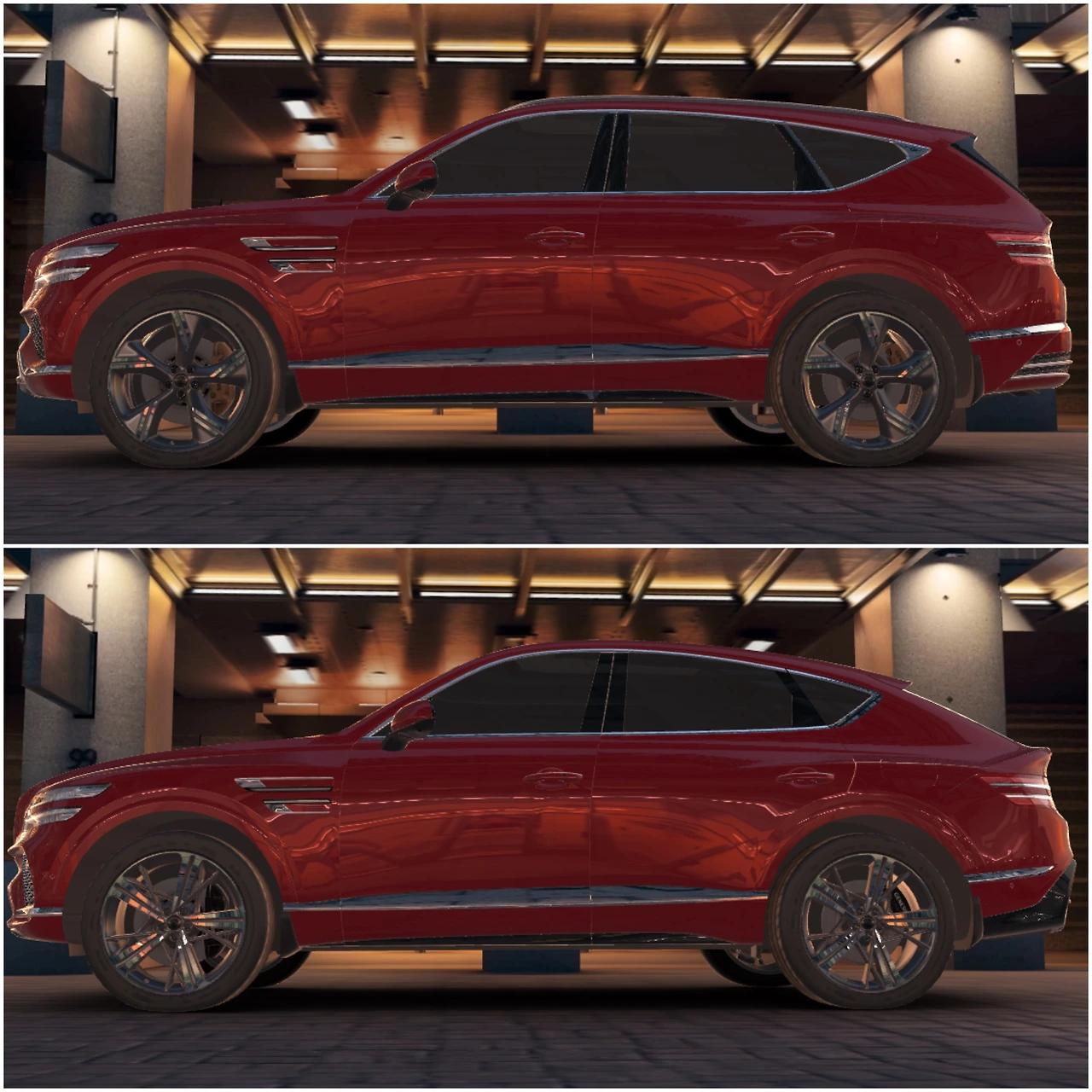 쿠페는 1열 이후부터 루프 라인이 달라지는데, 동급 경쟁 모델인 BMW X6나 벤츠 GLE 쿠페와는 지붕선과 측면 윈도 처리에서 완전히 다른 접근을 합니다. 특히 좁아진 트렁크 공간 확보를 위해 리어 오버행을 크게 키운 경쟁 모델과 달리 GV80 쿠페는 1.5cm 변화만 있습니다. 여기부터 차이가 생깁니다.