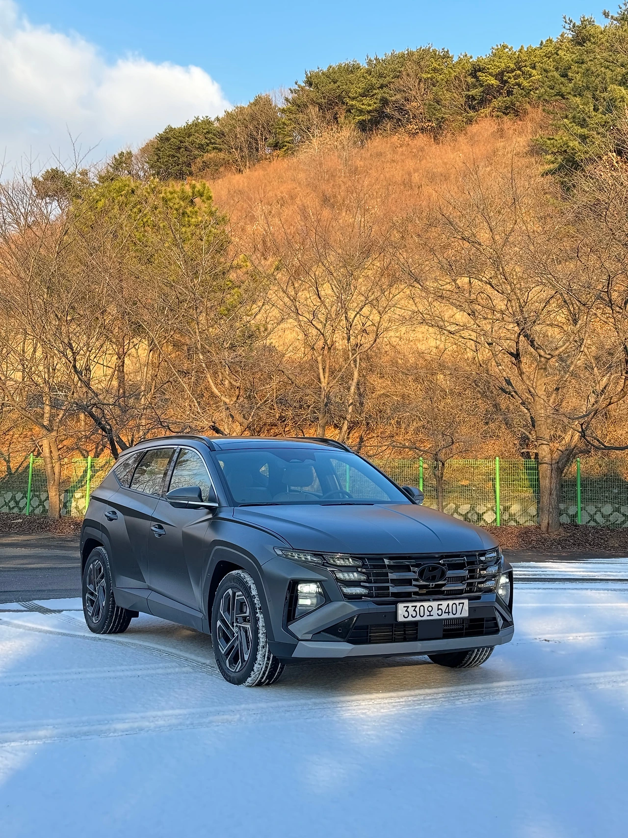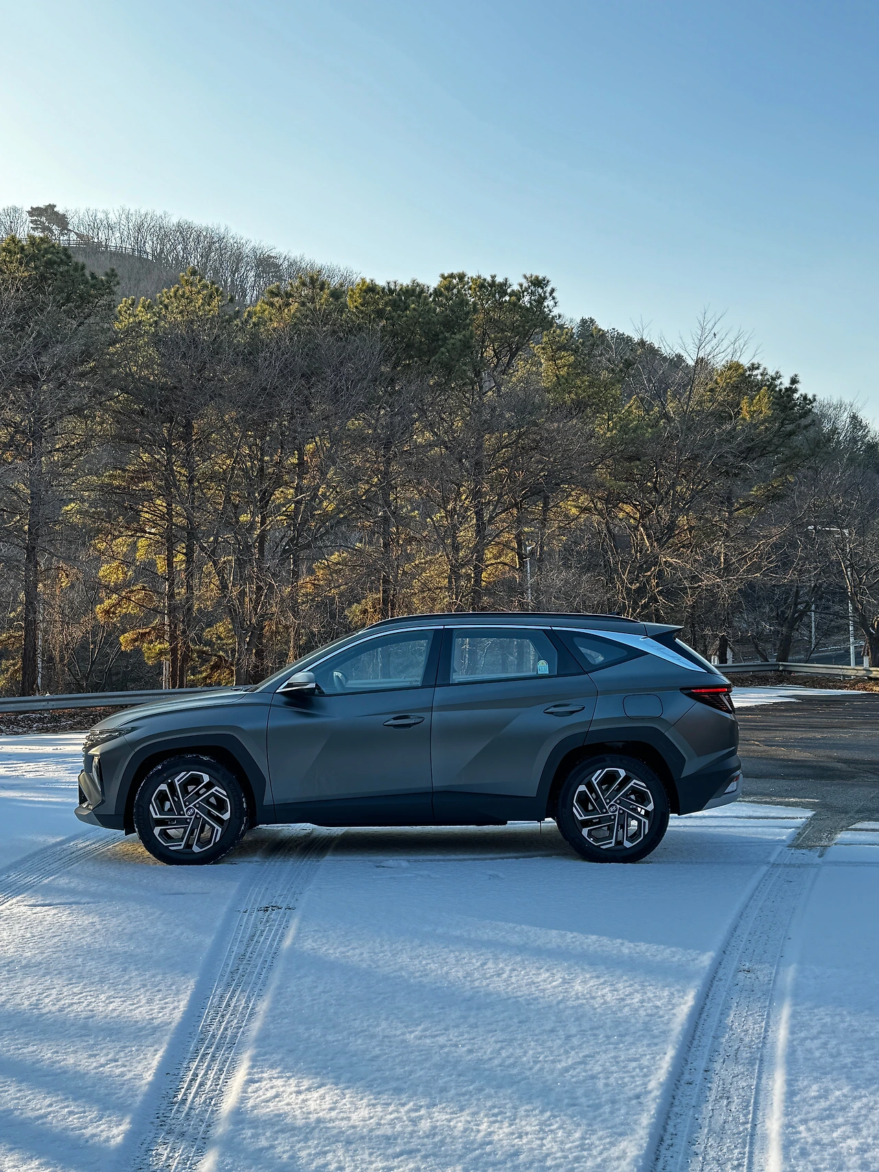 현대자동차 더 뉴 투싼 시승기입니다. 1.6 가솔린 터보 엔진 + 7단 DCT 조합의 2WD 인스퍼레이션 등급입니다. 파인그린매트라는 유료 옵션 컬러와 파노라마 선루프 포함 거의 모든 옵션이 더해져 차 값은 3835만 원입니다.