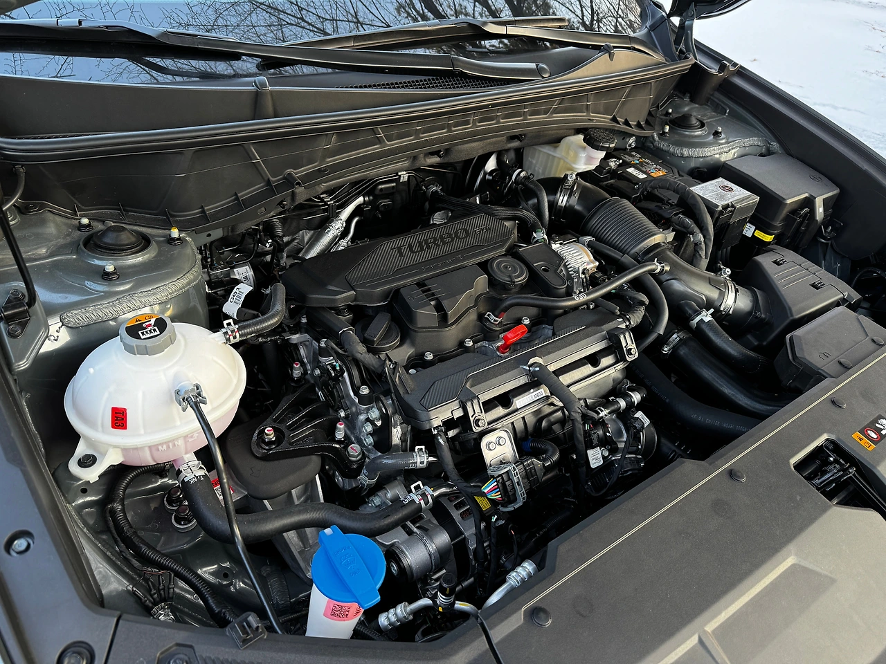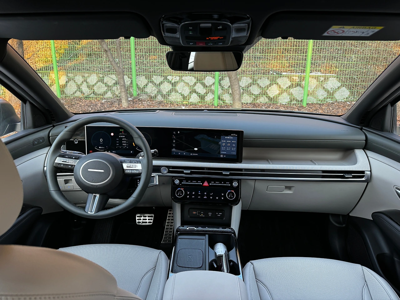 커브드 디스플레이를 쓰고 기어 레버를 스티어링 칼럼으로 옮긴 운전석 주변은 거의 새 차 분위기입니다. 윗급인 싼타페의 그것을 많이 가져오며 꽤나 고급스러워진 것도 사실입니다. 특히 시승차의 블랙-그린-그레이 3톤 실내는, 컬러뿐 아니라 여러 재질을 써 고급스럽게 보이도록 만들었습니다.