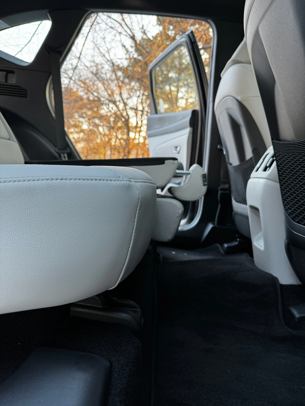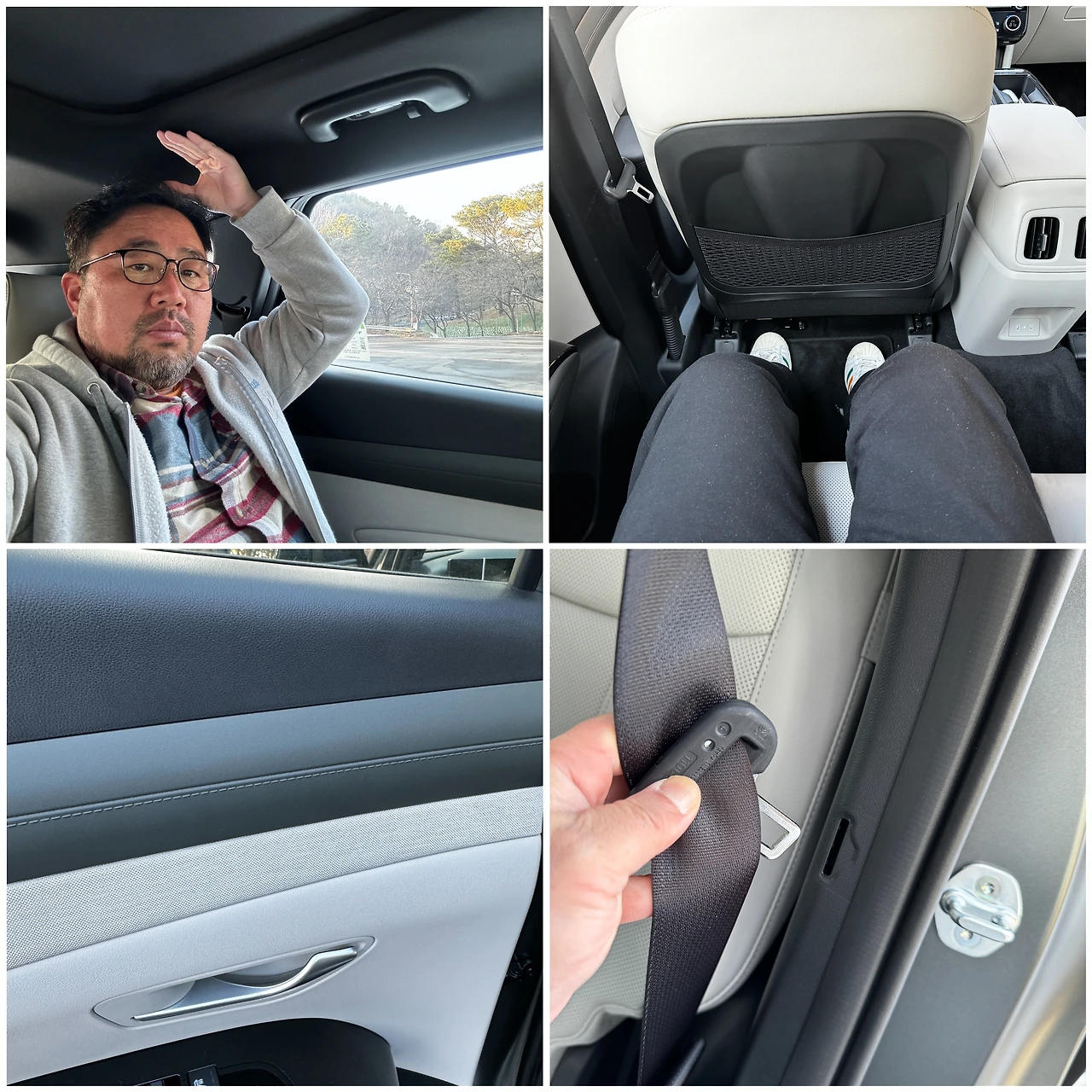 공간은 넉넉합니다. 특히 2열은 도어 트림의 재질이 (1열에 비해 상대적으로) 좀 떨어지는 것을 제외하면, 한 장의 유리인 2열 좌우 창이 완전히 내려간다거나 등받이 조절 각도가 크고 타고 내릴 때 걸리적거리지 않게 안전벨트 고정 홀을 만든다거나 등등, 꽤 신경 쓴 티가 납니다.
