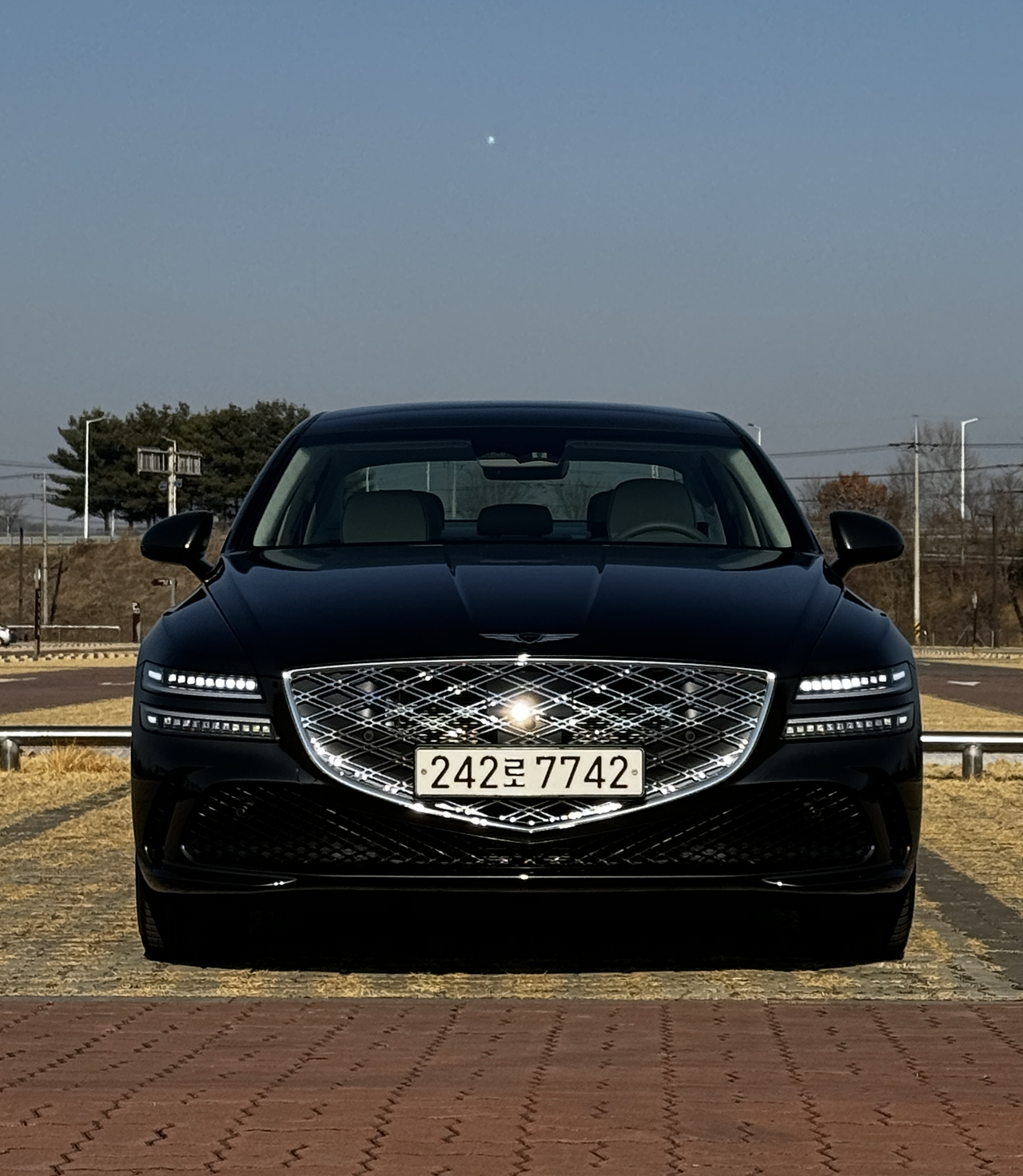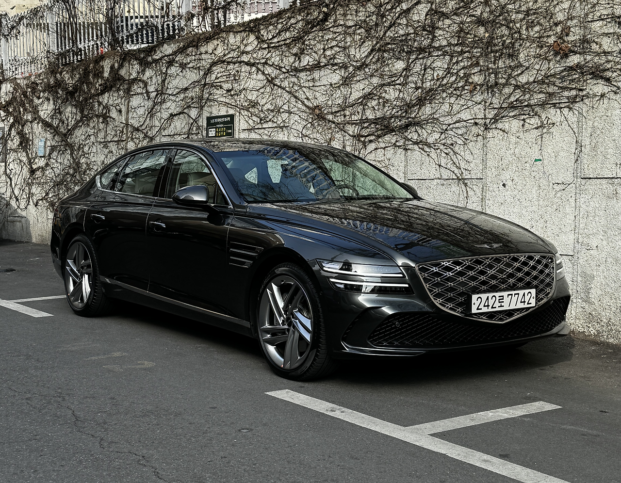 상대적으로 범퍼 아래쪽이 단순해진 것도 그릴과 헤드라이트를 더 강조하게 되더군요. 스포츠 패키지가 아닌 일반 모델은, 브랜드 아이덴티티인 라디에이터 그릴을 고급스럽게 바꾼 모습이 어울립니다. 이전 G80과도 확실하게 차별화가 되네요.