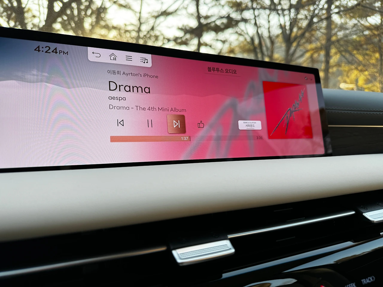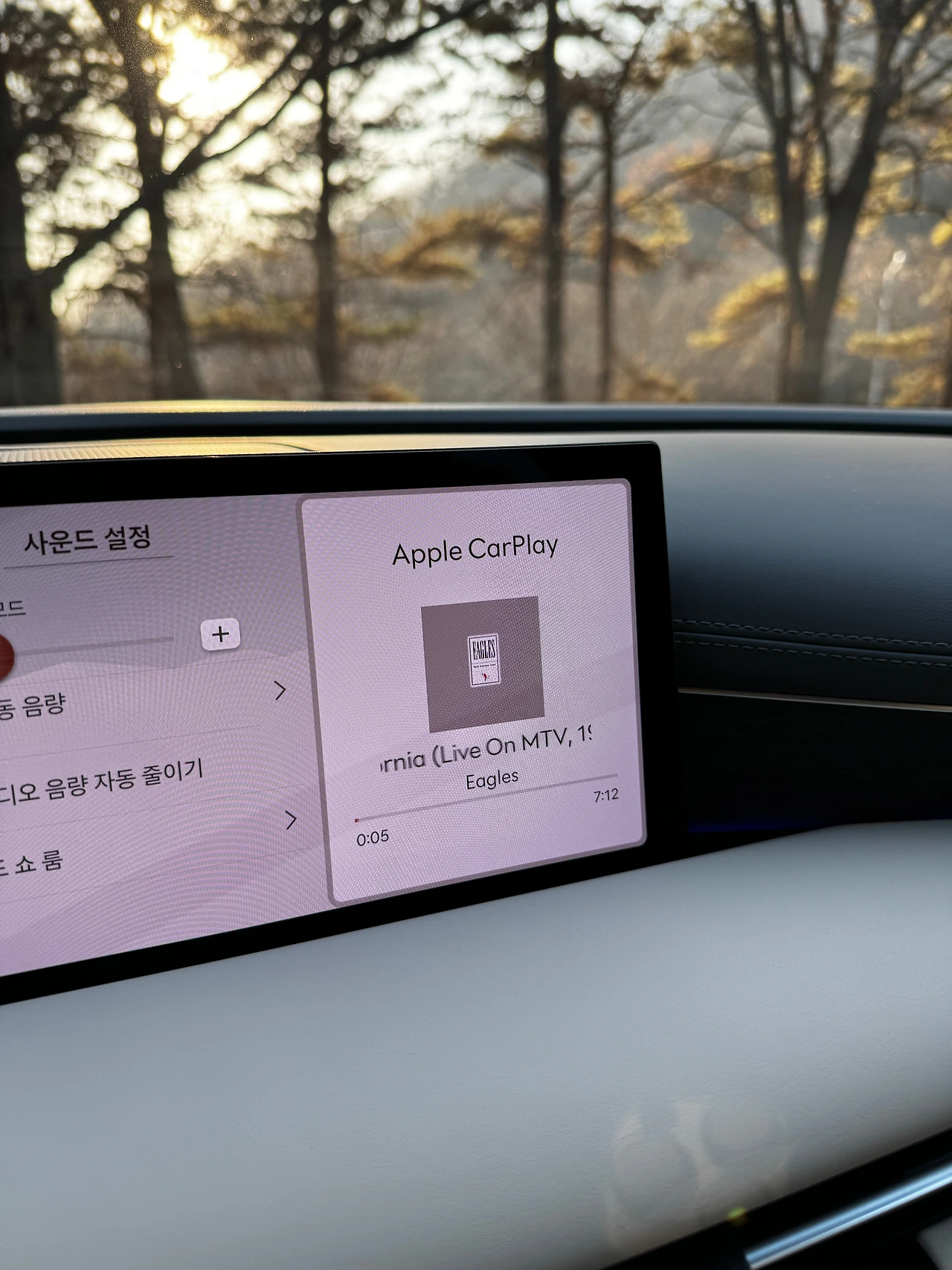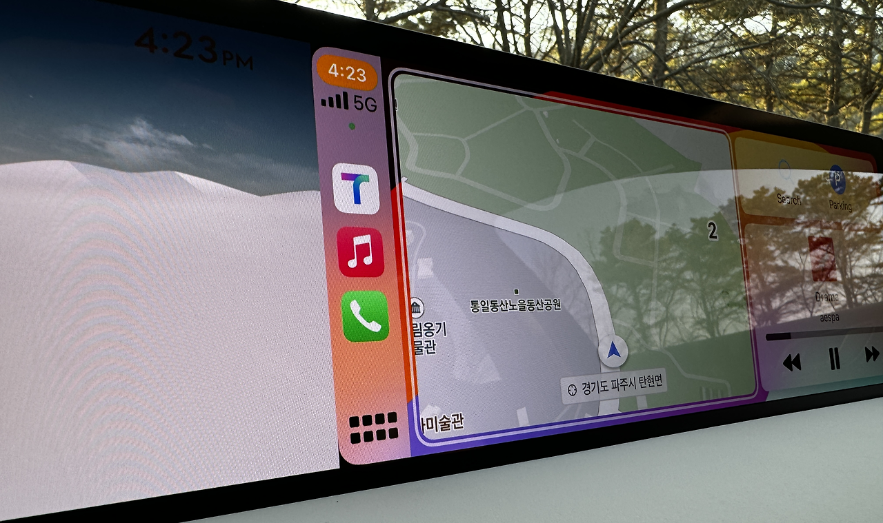 또 하나, 안드로이드 오토는 모르겠습니다만 애플 카플레이를 실행화면의 둥글게 마무리된 테두리와 차 AV 화면의 각진 끝부분이 거슬립니다. 위 사진이지요. 차 화면의 경계도 둥글려 맞춰야지요. 곡면이 애플 특허라서 안 하신 건지…