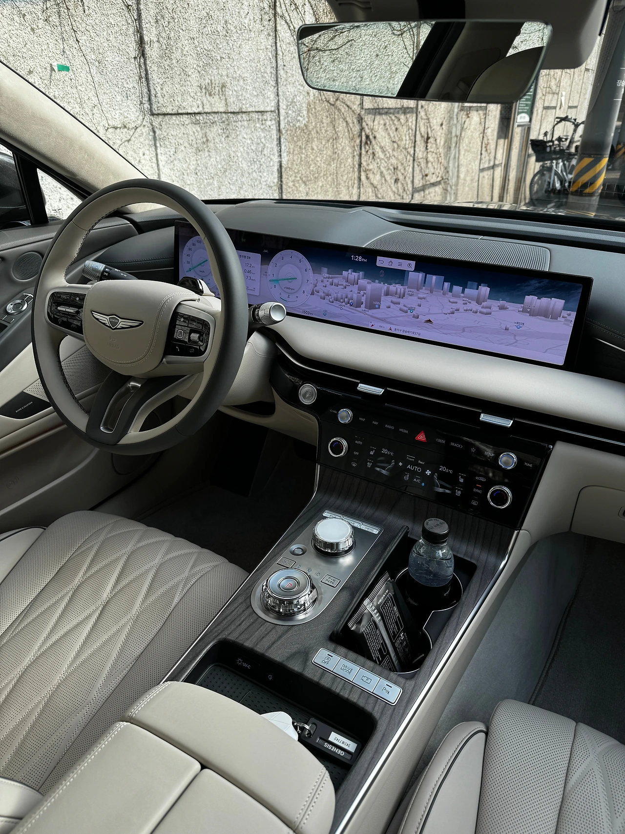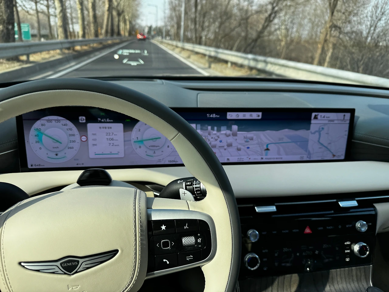 지금부터는 좀 아쉬운 부분입니다. 이번에 바뀐 27인치 OLED 스크린의 변화입니다. 운전석 앞 계기반과 센터패시아의 AVN 모니터가 연결되어 좌우로 다양한 콘텐츠를 보여주는 건 좋습니다. 특히 지도 모드 중 네온 와이드는 큰 스크린의 장점을 잘 살렸더군요. 그런데…